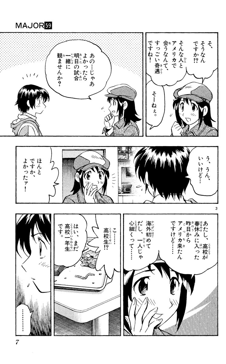 ●主な登場人物/茂野吾郎(高校卒業後、日本をとび出し、アメリカ3Aのバッツに入団し、抑え投手として活躍。160キロのストレートが武器の日本代表投手)、佐藤寿也(吾郎の幼なじみで、初めての野球友達。巨仁で新人王を獲得し、日本代表に追加招集された)