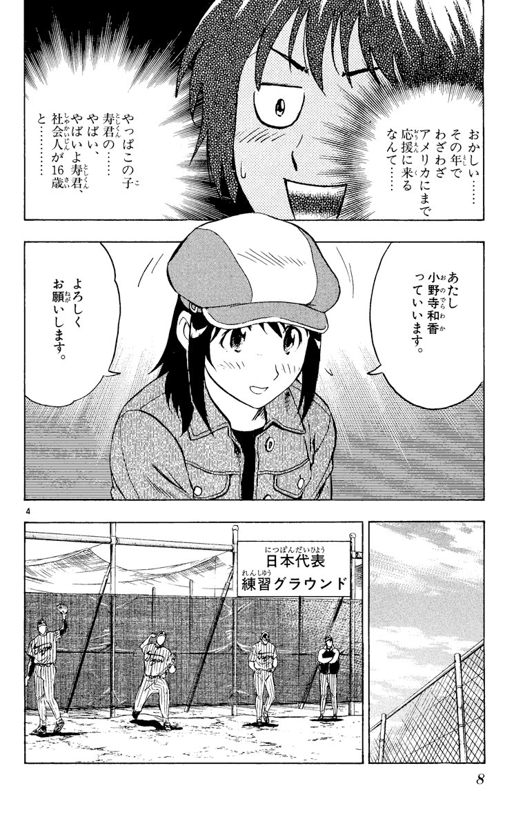 ●その他の登場人物/眉村(海堂高校時代のエースで吾郎のライバル。ルーキーで唯一、最初から日本代表に選ばれた)、大木(野球W杯の日本代表監督)、茂野英毅(吾郎の父親で元プロ投手。日本代表の投手コーチ)、コジロー・松尾(アメリカで活躍する日本人メジャーリーガーたち)、清水薫(ソフトボール部に所属する女子大生。吾郎の幼なじみで恋人に)