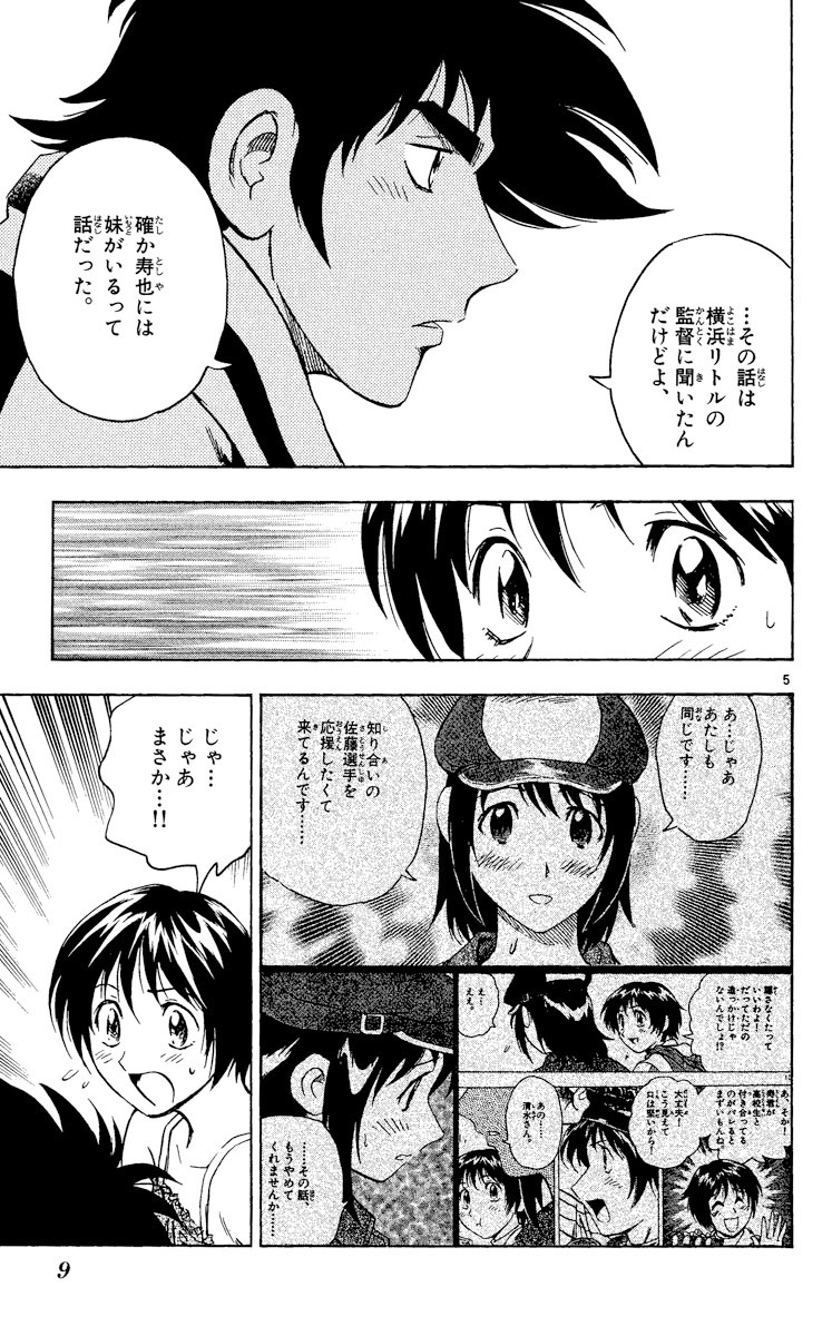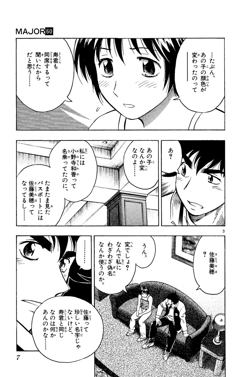 ●その他の登場人物/清水薫(ソフトボール部に所属する女子大生。吾郎の幼なじみで恋人) 、佐藤美穂(寿也の妹。7年前、両親が寿也を捨てて夜逃げして以来、生き別れになっていた)、大木(野球W杯の日本代表監督)、茂野英毅(吾郎の父親で元プロ投手。日本代表の投手コーチ)