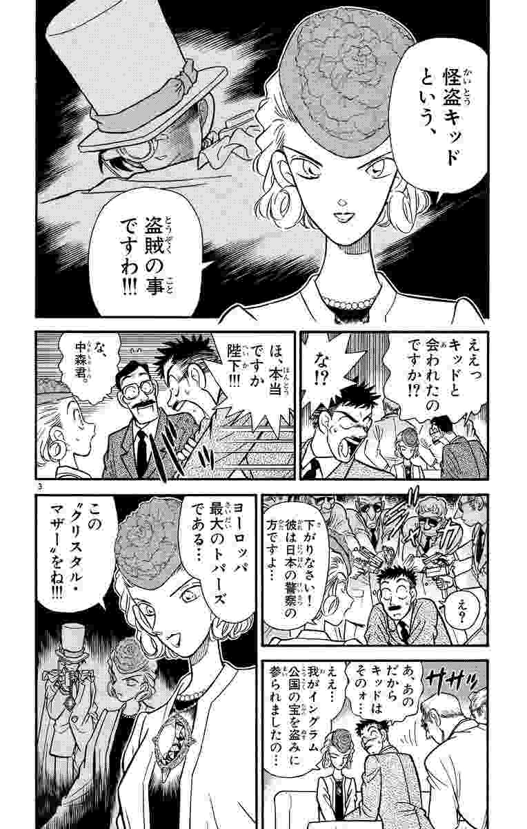 ●あらすじ/豪華列車ロイヤル・エクスプレス車内に怪盗キッドが出没。狙いは、この列車に乗車中のイングラム公国女王・セリザベスが持つ宝石“クリスタル・マザー”。予告状で事前に知っていた中森警部たちも同乗していたが、なんと女王は自分自身で彼と勝負がしたいと言いだした。別の車両にいた快斗は、青子に連れられて、警部と女王のいるサロン車にすんなりと入りこむが…?(クリスタル・マザー)