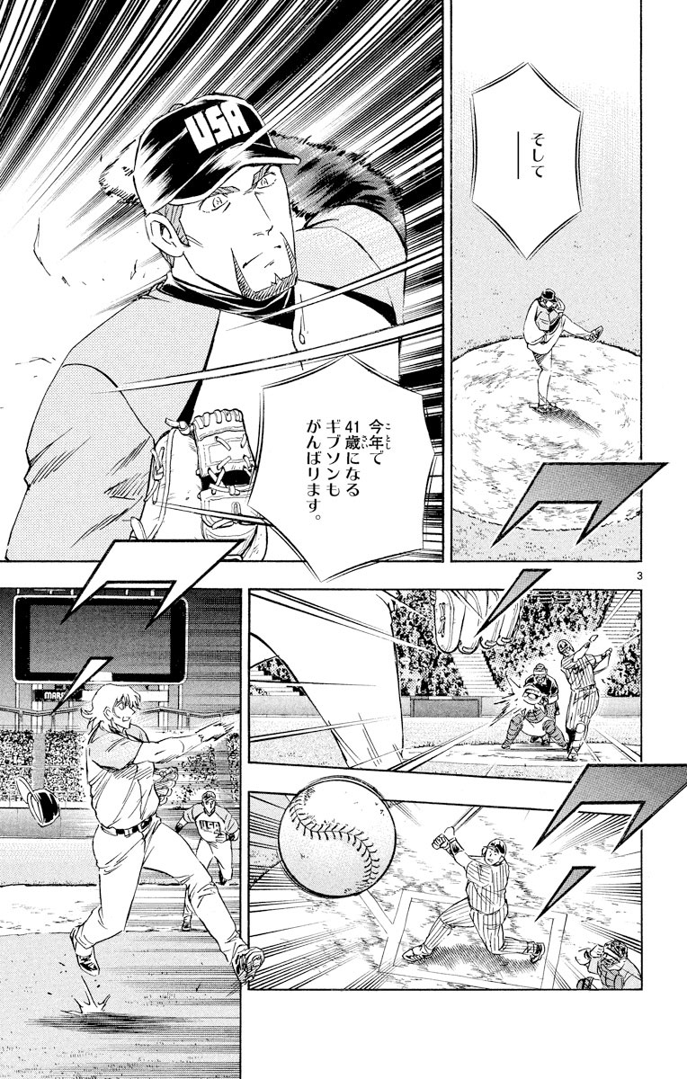 ●その他の登場人物/ジョー・ギブソン(メジャーの大エース。かつて吾郎の実父・本田茂治を死球で殺してしまった過去を持つ)、ギブソンJr.(ギブソンの息子。3A時代の吾郎のライバル。メジャー昇格を果たし、W杯アメリカ代表にも選出)、清水薫(ソフトボール部に所属する女子大生。吾郎の幼なじみで恋人)