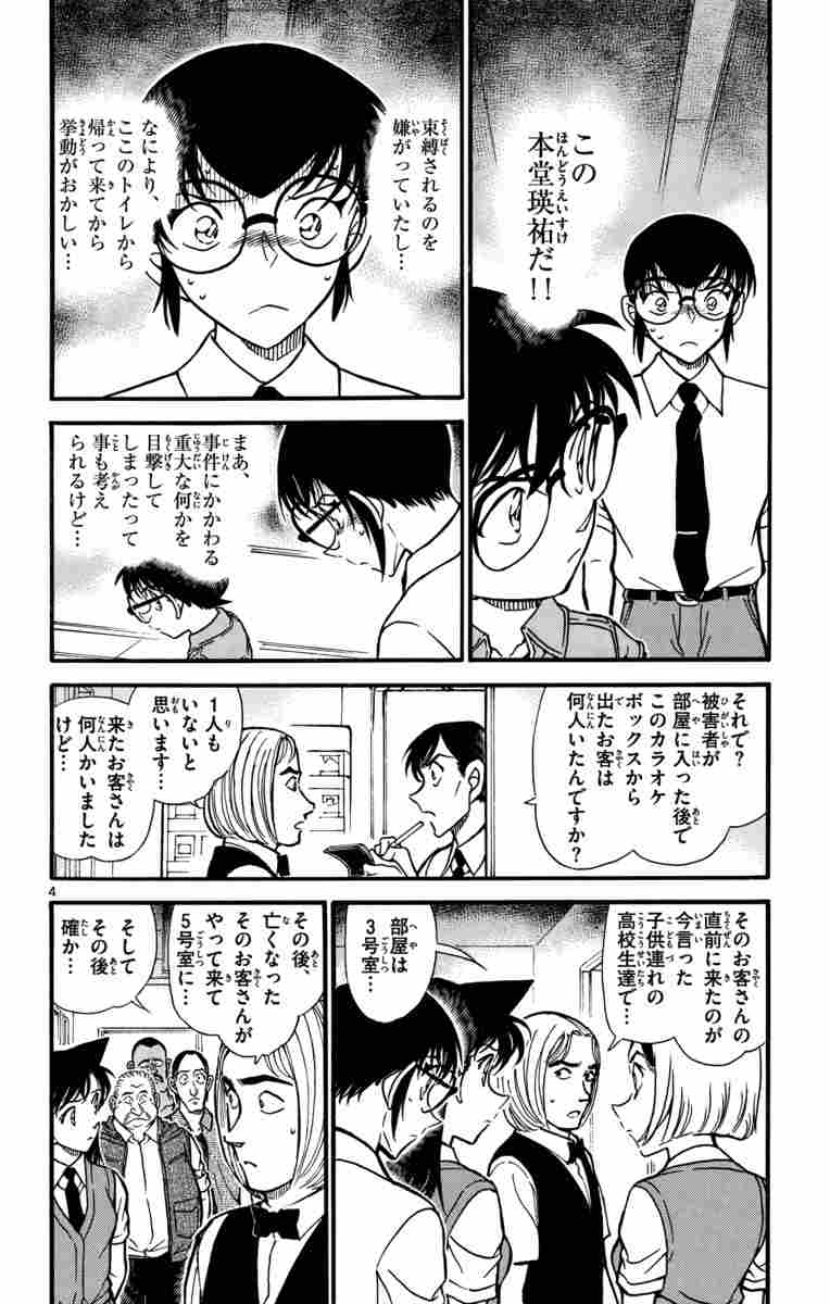 ▼第1話/消えた鈍器▼第2話/瑛祐の告白▼第3話/赤白黄色▼第4話/クロシロ君▼第5話/新たな隣人▼第6話/ハンマー男▼第7話/届けられた悪意▼第8話/ハンマー男の正体▼第9話/殺意のコーヒー▼第10話/不可能犯罪▼第11話/苦い真実●主な登場人物/江戸川コナン(見かけは小学生だが、その正体は「黒の組織」に毒薬を飲まされて体が小さくなった高校生名探偵・工藤新一)、毛利蘭(新一の幼なじみ。帝丹高校2年)、毛利小五郎(蘭の父親で探偵。コナンのおかげで“眠りの小五郎”として有名に)●あらすじ/コナン、蘭、園子、瑛祐の4人が訪れていたカラオケボックスの一室で殺人事件が発生。店員の証言や防犯カメラなどで割り出した容疑者は、トイレに行っていた瑛祐を含む4人の男だが、どの容疑者の身辺からも被害者を撲殺した凶器が見つからないまま。さらに被害者の所持していたカメラを調べると、コナンたちをストーカーしていた写真ばかり撮られていて…(第1話)。●本巻の特徴/前巻から続くカラオケボックス殺人事件(第1~2話)。「赤白黄色」が犯人を暴く放火殺人未遂事件(第3~5話)。ハンマー男の連続暴行事件(第6~8話)。TVディレクター殺人事件の全4編を収録。●その他の登場人物/小嶋元太・吉田歩美・円谷光彦(コナンの同級生たち。少年探偵団を結成)、灰原哀(新一が飲まされた毒薬の開発者だが、自らも薬を飲んで「黒の組織」から逃亡。阿笠の家に居候中)、阿笠博士(工藤家の隣りに住む科学者。新一とコナンが同一人物だと知っている)、鈴木園子(蘭や新一の同級生。自称・推理クイーン)、本堂瑛祐(蘭のクラスに来た転校生。かなりドジ)