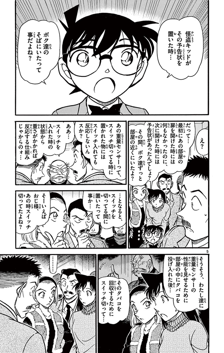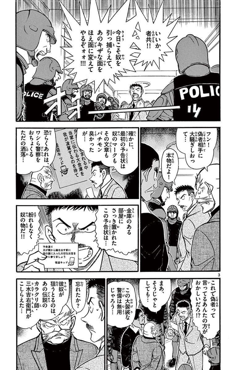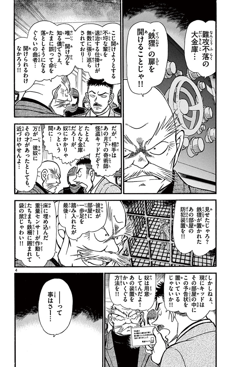 ●あらすじ/怪盗キッドから宿敵・鈴木次郎吉に、難攻不落の大金庫“鉄狸”を狙うとの予告状が2通届いた。1通目は文体やマークから偽物と思われたが、金庫部屋に置かれた2通目は本物だと確信した中森警部。部屋のそばにいて最近雇われたというボディーガード・使用人・メイドの3人に疑いがかかるが、次郎吉は自分が雇った者を証拠もなしに調べるなといって自室に戻ってしまう。いつもの様子とは違う次郎吉の行動に、コナンは違和感を感じるが…(第1話)。