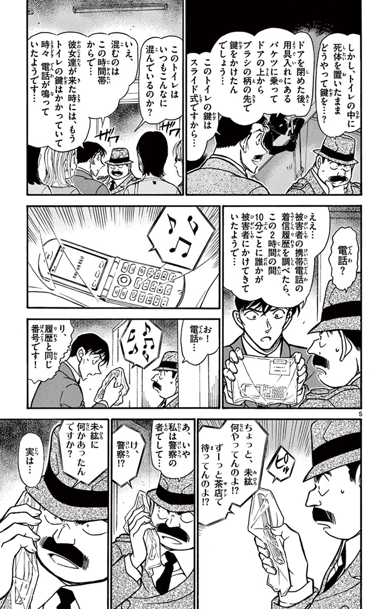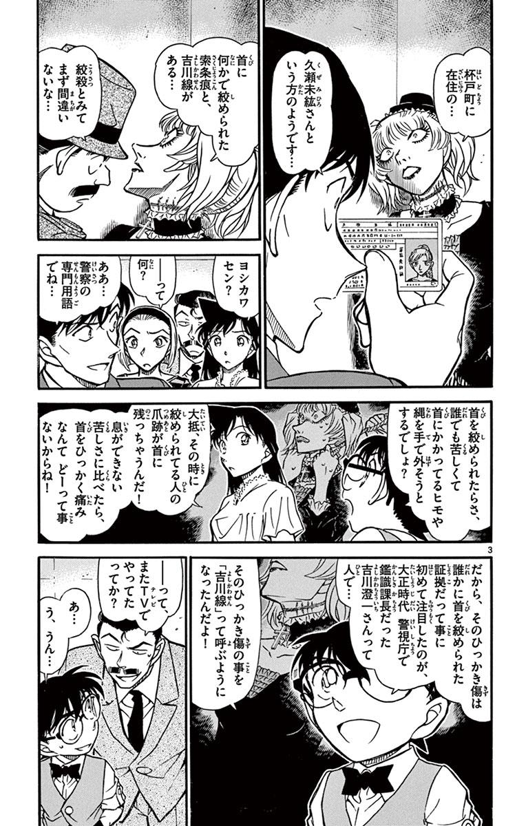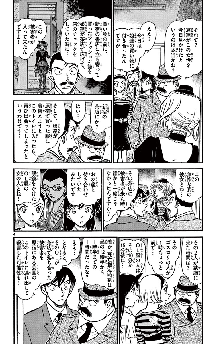 ●あらすじ/蘭たちの買い物の付き添いで原宿に来たコナンと小五郎。だが、偶然立ち寄った公園のトイレ内で、絞殺死体を発見! しかも被害者は、少し前に新宿の喫茶店でも見かけていたゴスロリ服姿の女性だった。その後、喫茶店や被害者が服を買った店など調べているうち、待ち合わせ相手の友達が怪しいと推理するコナン。だが彼女には犯行時刻、新宿にいたという完璧なアリバイがあり…?(第1話)