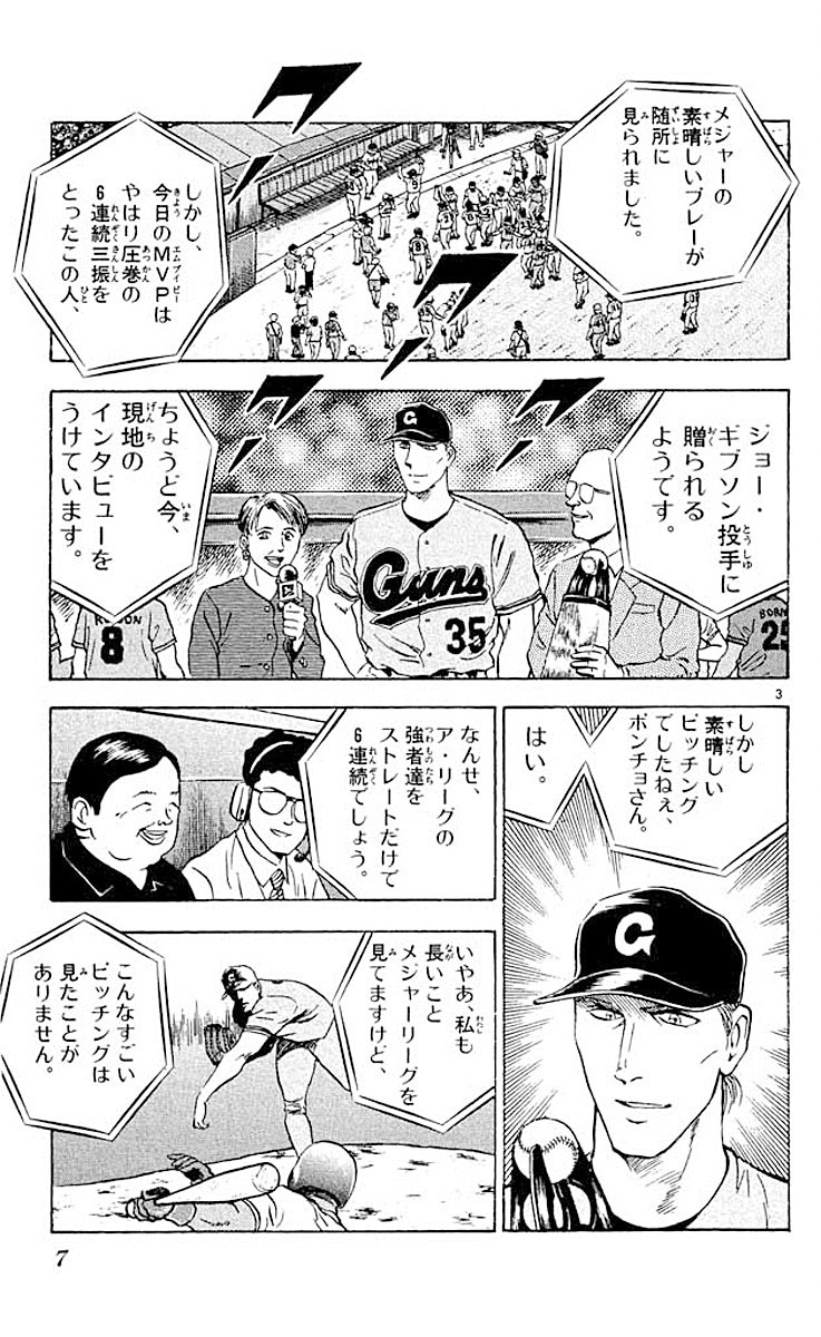 ●登場人物/本田吾郎(亡くなった父の職業であったプロ野球選手を目指す少年)、ジョー・ギブソン(アメリカメジャー・リーグの選手)、上河内(リトルリーグ全国レベルのバッター)、清水薫・本田・沢村(吾郎の所属する草野球チームの一員)、樫本監督(横浜リトルの監督。プロ野球戦手の卵を育成している)