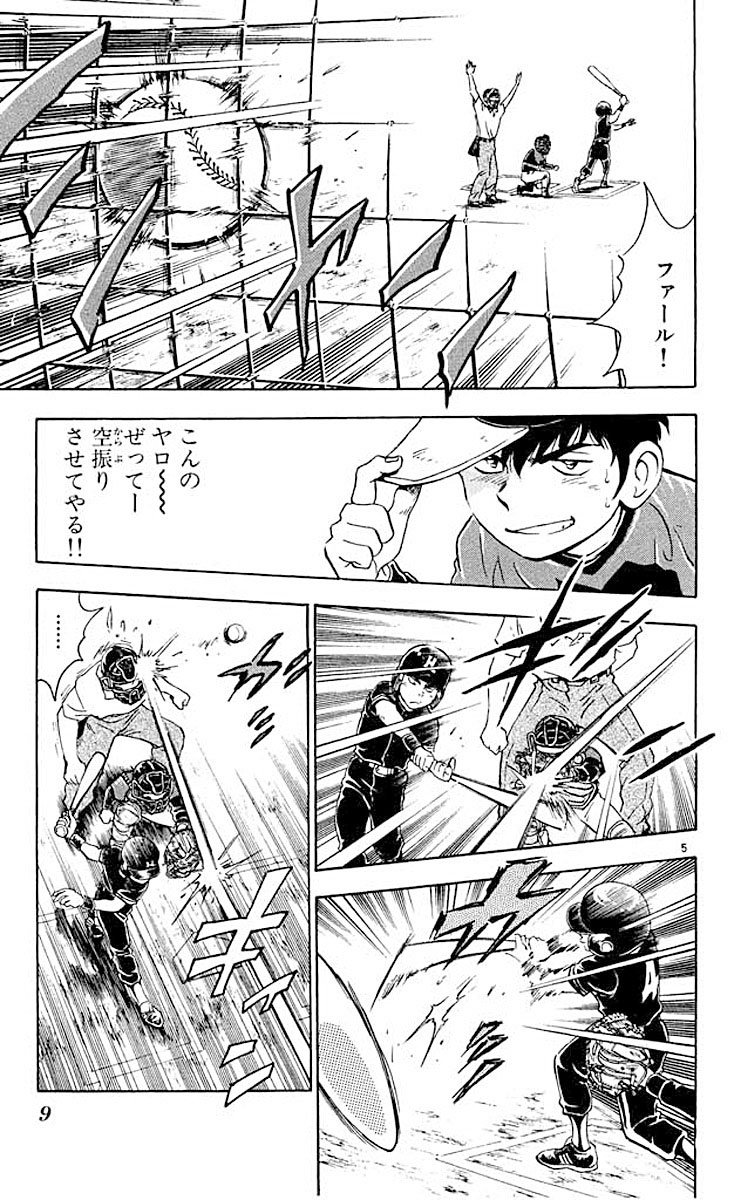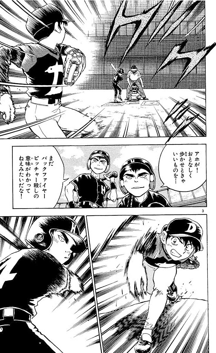 ●登場人物/本田吾郎(亡き父の職業だったプロ野球選手を目指す少年。三船リトル所属)、清水薫(御船リトルのライトを守る女の子)、岡村一郎・二郎・三郎(本牧リトルの三兄弟。「ブラック・トライアングル」という守備態勢が得意)、星野桃子(両親を亡くした吾郎の母親となって一緒に暮らしている)、茂野英毅(吾郎の父、故・本田茂治の高校時代の旧友。プロ野球選手)、宇佐美球太(三船リトルの対戦相手、戸塚西リトルの投手)
