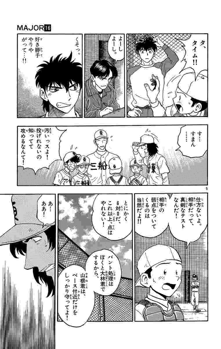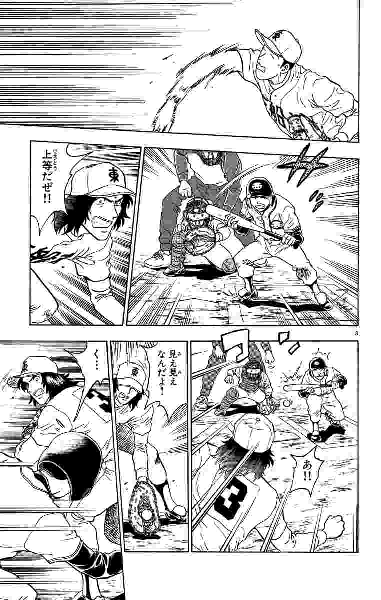 ●登場人物/茂野吾郎(亡き父親の職業であったプロ野球選手を目指している中学生)、小森(三船東中野球部のキャプテン。リトルでは吾郎と同じチームだった)、山根(一度は野球ができなくなり絶望していたが、再度頑張ることを決意し野球部に入る)