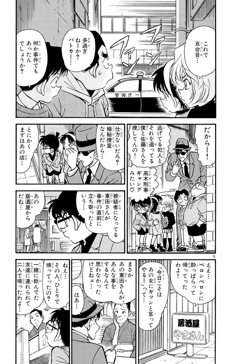 ●あらすじ/元太、哀、歩美たちと学芸会の練習をしていたコナンは、脱走犯とそれを追いかける佐藤・高木刑事と出会う。佐藤刑事は追跡の末、古いビルの一室で犯人を捕獲するが、脱走犯は無実を主張。身動きがとれなくなった佐藤刑事に代わり、高木刑事とコナンたちは真犯人捜しを始めるが……。(第1話)