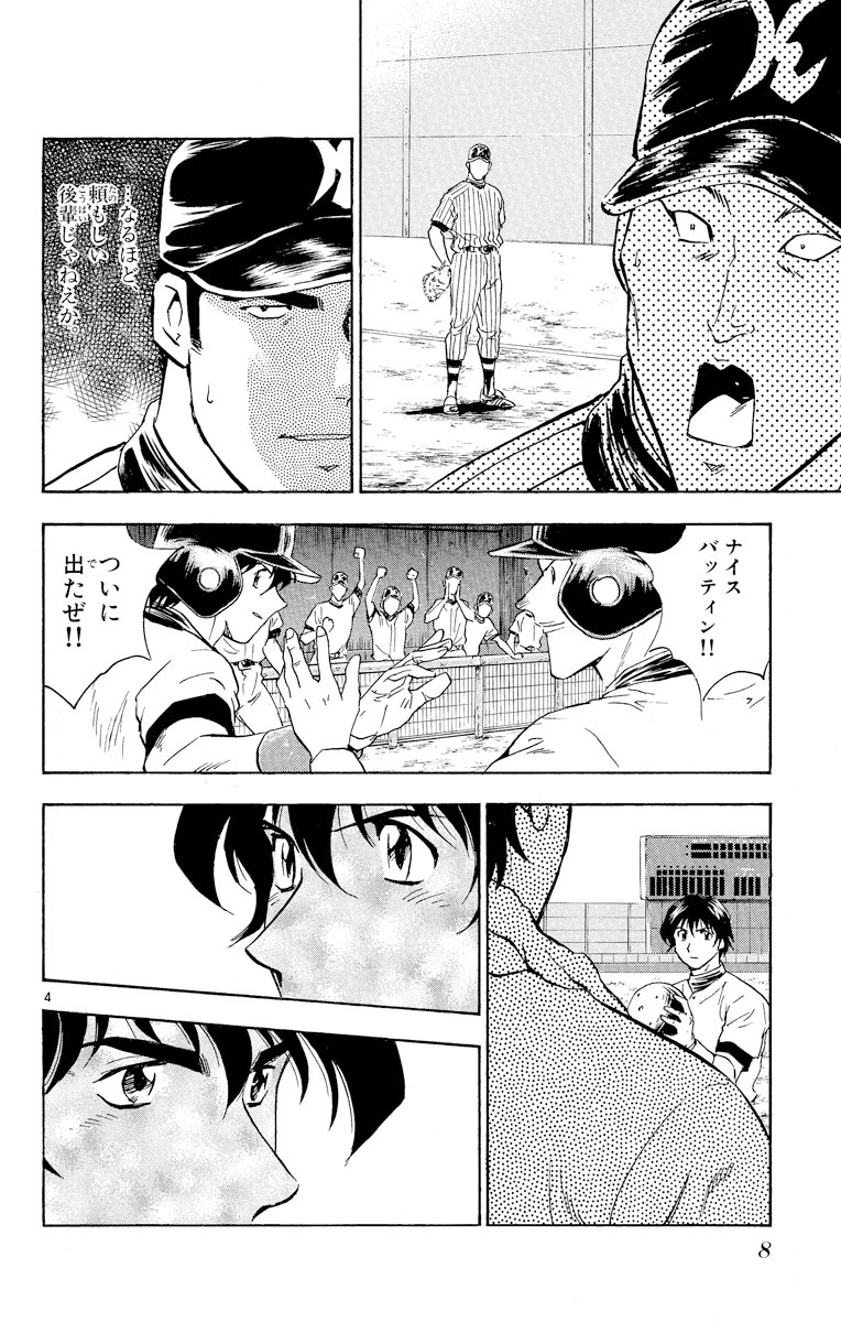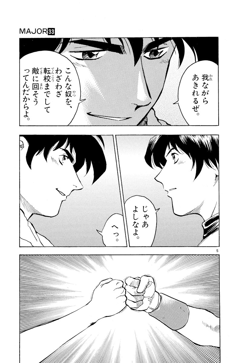 ▼第1話/あばよ。▼第2話/せんべつ▼第3話/俺だけじゃねえ▼第4話/バイト大作戦▼第5話/江頭の脅迫▼第6話/いくつになっても▼第7話/いるよ▼第8話/聖秀学院編入▼第9話/エースで四番●登場人物/茂野吾郎(名門・海堂高校野球部の2年生。実の父も義理の父もプロ野球選手)、佐藤寿也(吾郎と一緒に海堂高校野球部に入部した天才捕手。通称トシ)、早乙女静香(海堂高校野球部二軍監督)、早乙女泰造(抜群のマッサージ技術を持つ、二軍のコンディショニングトレーナー。静香の兄。なぜかオカマ)●あらすじ/7回裏を迎えた、一軍対二軍の壮行試合。ここで二軍は寿也が逆転ツーランを放ち、2対1と逆転する。その後の8回、9回の一軍の攻撃も、吾郎が150キロの豪速球でねじふせ、二軍は一軍を倒した。手のひらを返したように、吾郎を絶賛する江頭。だが吾郎は「海堂の肩書も、親父の肩書も必要ねえ。そんなもんに頼らなくても実力でスターになる自信がついた」と言い、その場から去ってしまう(第1話)。●本巻の特徴/海堂のマニュアル野球に嫌気がさした吾郎は、一軍を倒したことを置き土産にあっさりと退学。野球の弱い学校に編入し、自分の手で強くしようと考えていた。最初に行こうと思ったのは、旧友たちがいる市立三船高校。だが三船高の試合を見に行った吾郎は、かつての仲間達が努力を重ね、相当に成長していることを知った。その和を壊す事はできないと思った吾郎は三船高を諦め、次に私立江田原高校へ。しかしここには江頭の圧力がかかっていて、願書を出した段階で入学を拒否されてしまう。江頭の陰謀は県内のほとんどの高校に及び、吾郎が高校で野球を続けるのは困難な状況になってしまった。残された方法は、ただひとつ。それは、野球部のない学校に編入し、自分で部を作ることだった。そして吾郎は、男子38名、女子452名という私立聖秀学院に編入する。再びゼロから出発する吾郎の姿が描かれる、新展開の第33集。●その他の登場人物/江頭哲文(海堂高校野球部チーフマネージャー。別名監督代行で、海堂の実質ナンバー2)