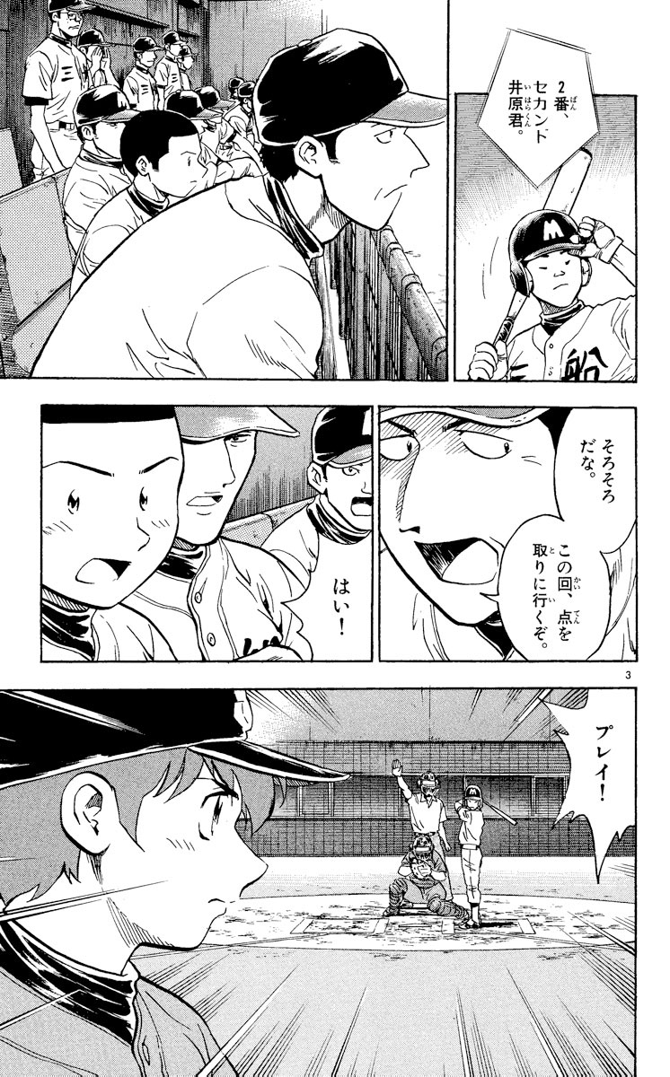 ▼第1話/中盤戦の攻防▼第2話/なんなんだ!?▼第3話/選手交代▼第4話/初めてのチャンス▼第5話/開け! 突破口▼第6話/勝負はこれから▼第7話/俺までまわせ!!▼第8話/ホントの気持ち▼第9話/あいつとだけは▼第10話/勝ち越すまでは●主な登場人物/茂野吾郎(名門・海堂高校から、野球部のない私立聖秀学院に編入。甲子園を目指し、再びゼロから出発する)●あらすじ/夏の甲子園大会予選、2回戦。聖秀の相手は吾郎の旧友・小森、山根らがいるシード校・三船高校だ。吾郎はこの試合の先発を大河に託し、自分は痛み止めの注射を打って、戦いをベンチで見守る。0対0で迎えた4回裏、三船の攻撃。二順目の三船打線は大河を捕らえ、一気に3点を先制する(第1話)。●本巻の特徴/必死に反撃を試みる聖秀。だがクロスプレーで宮崎が眼鏡を割ってしまい、試合に出ることができなくなってしまった。そこで聖秀は遂に吾郎が登場。ファーストに入り、チームを盛り上げる。だが、なかなか追いつくことが出来ない。このまま聖秀は敗れてしまうのか…!?●その他の登場人物/清水薫(ソフトボール部のエース。吾郎の幼なじみ)、清水大河(薫の弟。リトルリーグ、シニアリーグで5年間レギュラーだった実力派。聖秀に入学しショートを守る。吾郎のケガに伴い、ピッチャーも兼ねることに)、藤井(野球には興味がなかったが、吾郎に出会って心が動き、本気で取り組みだす。ポジションはセカンド)、田代(父親に野球を禁止されてやる気をなくしていたが、吾郎の姿を見て発奮。キャッチャーをつとめる)、中村美保(吾郎に興味を持ち、野球部の押しかけマネージャーになった女子生徒。薫とは犬猿の仲)、山田一郎(聖秀学院の英語教師。野球部の顧問を頼まれ引き受ける。日本に帰化したアメリカ人で、元の名はスティーブ・ティモシー)