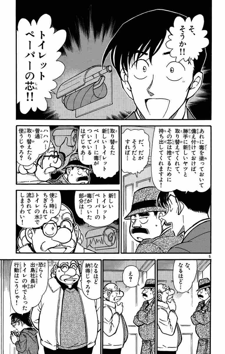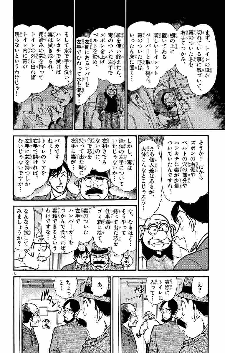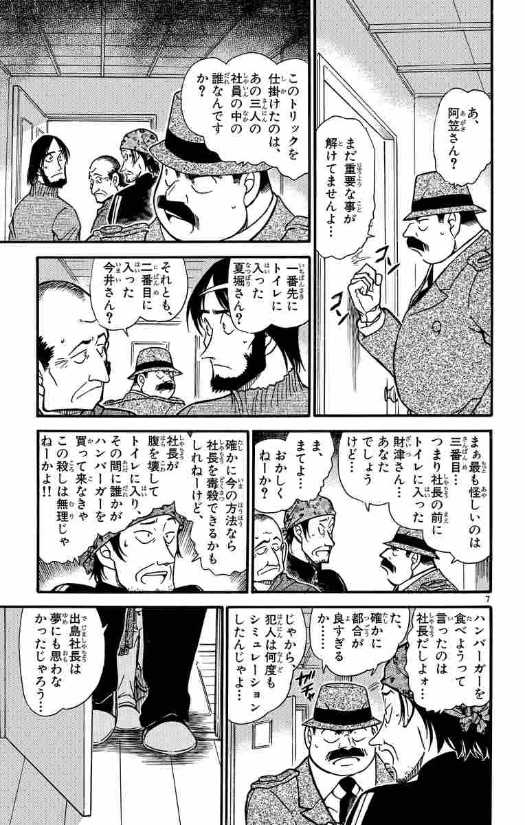 ▼第1話/隠されていた真実▼第2話/good-byeジョディ▼第3話/蘭の推理▼第4話/信じられない結末▼第5話/満月の夜と黒い宴の罠▼第6話/血塗られた幽霊船▼第7話/透明人間現る!▼第8話/工藤新一登場!?▼第9話/仮面の下の真実▼第10話/ラットゥンアップル▼第11話/雨中の刻印●主な登場人物/江戸川コナン(見かけは小学生だが、その正体は「黒の組織」の男たちに薬を飲まされ身体が縮んでしまった高校生名探偵・工藤新一)、毛利蘭(帝丹高校に通う新一の幼なじみで、ガールフレンド)、毛利小五郎(蘭の父親。妻に逃げられ、娘の蘭と二人暮らしのヘボ探偵だったが、コナンのおかげで世間からは名探偵だと思われている)●あらすじ/「黒の組織」の手がかりを求めて出島のデザイン事務所へ向かったコナンは、デザイン事務所社長・出島の毒殺事件に遭遇する。遺体の左手、ベルト、ハンカチ、そして直前に食べたハンバーガーから毒物反応が検出されるが、他のどこからも毒物の痕跡は見い出せない。その死のトリックをコナン、阿笠博士、灰原の3人が暴く。●本巻の特徴/「隠されていた真実」は前巻から続いての物語の完結編。「good-byeジョディ」~「信じられない結末」は、コンビニでバイトをする蘭の友人・絢に泥棒の疑いがかけられているところを訪れた蘭、園子、ジョディの3人が、コナンの助けを借りずに推理を試みる。「満月の夜と黒い宴の罠」~「仮面の下の真実」は、幽霊船上での仮装パーティーで起きた殺人事件の裏で、哀とコナンをつけ狙う“黒の組織”が暗躍、ふたりに危機が迫る。「雨中の刻印」では、子どもを狙って「5」の刻印を残していく謎の通り魔事件が発生する。●その他の登場人物/目黒警部(警視庁の鬼警部。小五郎の元上司)、阿笠博士(新一の隣人で、日夜発明にいそしむ天才科学者)、灰原哀(「黒の組織」で薬物を研究していたが、組織を裏切りコナンと同じ薬を飲んで、子供の姿で逃亡)、ジョディ・スターリング(帝丹高校の英語教師をしているが、その真の姿は…)、鈴木園子(蘭の親友。鈴木財閥のお嬢様だが、気取った所がない気さくな女の子)、服部平次(関西の高校生探偵。「西の名探偵」として「東の名探偵・工藤新一」と並び称される、新一のライバル)