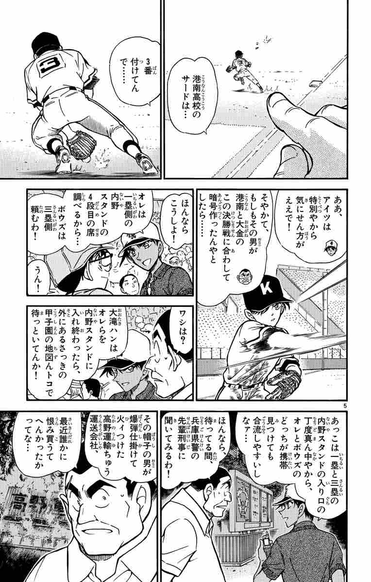 ▼第1話/3つの数字の謎を解け!▼第2話/ヒントが無い!?▼第3話/試合終了(ゲームセット)…!?▼第4話/天国から地獄▼第5話/全然平気!?▼第6話/疑わないの?▼第7話/奇蹟▼第8話/驚愕▼第9話/戦慄▼第10話/脱出▼第11話/学校奇譚●主な登場人物/江戸川コナン(見かけは小学生だが、その正体は「黒の組織」に薬を飲まされ子供の姿になった高校生名探偵・工藤新一)、毛利蘭(帝丹高校に通う新一の幼なじみで、ガールフレンド)、毛利小五郎(蘭の父親。妻に逃げられ、娘の蘭と二人暮らしのヘボ探偵だったが、コナンのおかげで世間からは名探偵だと思われている)●あらすじ/平次達と夏の高校野球決勝戦を見に来たコナンは、座席の下にあった携帯電話を拾う。落とし物だと思われたケータイに“甲子園の魔物”と名乗る謎の男から球場を巻き込む自爆予告の電話がかかってきた! 自爆を止めるにはメールで送られてきた数字の暗号を解き、男の居場所を探し当てなければならない。タイムリミットの試合終了時までに数字の謎を解く事はできるのか!?(第1話)●本巻の特徴/4~6話では、高木刑事に鳥取の合同捜査本部への長期派遣の話が持ち上がる。はたして、佐藤刑事との恋の行方は…? また7~10話では、怪盗キッドが登場! コナンvsキッドの頭脳戦、勝つのはどっちだ!? さらに11話では、蘭たちの高校で幽霊騒動が持ち上がる、謎を解くためにコナンは久しぶりに高校の門をくぐることになるが…。●その他の登場人物/服部平次(関西の高校生探偵。新一のライバル)、佐藤美和子(警視庁捜査一課の刑事。同僚男性のアイドル的存在)、高木渉(警視庁捜査一課の刑事。佐藤刑事に好意を寄せている)