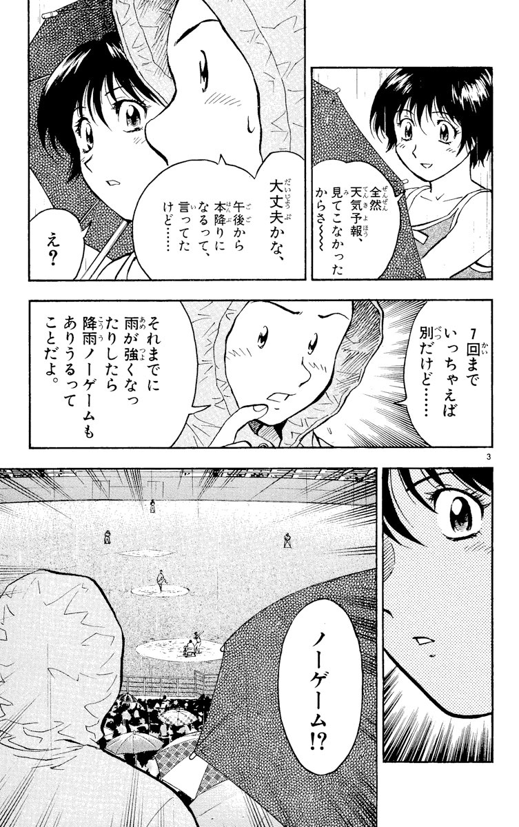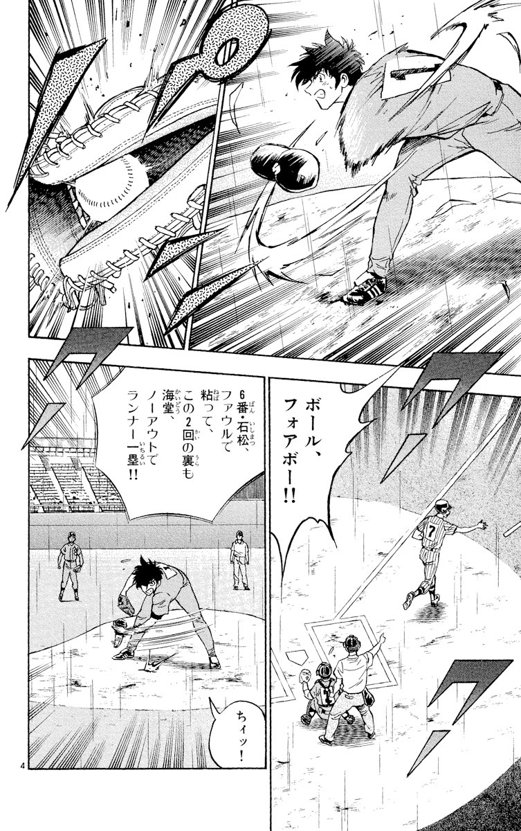 ▼第1話/怪しい雲行き▼第2話/ダメ元作戦▼第3話/清水の狙い▼第4話/バウンド投球▼第5話/無茶な作戦▼第6話/不敵な笑み▼第7話/狙い打ち▼第8話/ぬける球▼第9話/Never Give Up!! ▼第10話/どしゃ降りの雨●主な登場人物/茂野吾郎(名門・海堂高校から、野球部のない私立聖秀学院に編入。経験者は数人しかいない野球部を作り、再びゼロから甲子園を目指す)●あらすじ/夏の甲子園を目指しての神奈川県予選準々決勝。聖秀学院は、いよいよ王者・海堂と対戦する。初回、海堂は手堅いスクイズ攻撃で1点を先取。続く2回裏も海堂の攻勢は続く。先頭打者がフォアボールを選び、すかさず盗塁。次打者のファーストゴロの間に3塁へ進み、1死3塁と追加点のチャンスを迎えた。ここで海堂はまたしてもスクイズを仕掛けてくるが、吾郎はそれを阻止するために、イチかバチかの作戦を実行する!!(第1話)●本巻の特徴/吾郎の力投で、聖秀は強豪・海堂を相手に健闘を続ける。しかし3回裏、2順目に入った海堂打線は、確実に吾郎をとらえだした。前日にビデオで吾郎の投球を研究し、決定的な攻略法を見つけた4番バッターの寿也が、ライトスタンドに突き刺さるスリーランを放ち、4対0とリードを広げる。だがここで、試合途中から降りだした雨の勢いが強くなった。審判団は中止か続行かを審議。海堂は当然、試合続行を主張する。また、普通ならノーゲームになれば命拾いのはずの聖秀も強行を望み、結局試合は続行される。そしてこの雨により、試合は思わぬ方向に展開しだす。●その他の登場人物/佐藤寿也(海堂の天才捕手。吾郎の初めての野球友達で、かつては吾郎とバッテリーを組んでいた)、江頭哲文(海堂高校野球部チーフマネージャー。別名監督代行で、海堂の実質ナンバー2)、清水大河(リトルリーグ、シニアリーグで5年間レギュラーだった実力派。聖秀に入学しショートを守る)、田代(父親に野球を禁止されてやる気をなくしていたが、吾郎の姿を見て発奮。キャッチャーをつとめる)、藤井(元はナンパ野郎で野球には興味がなかったが、吾郎の豪球を見て心が動き、本気で取り組みだす。ポジションはセカンド)