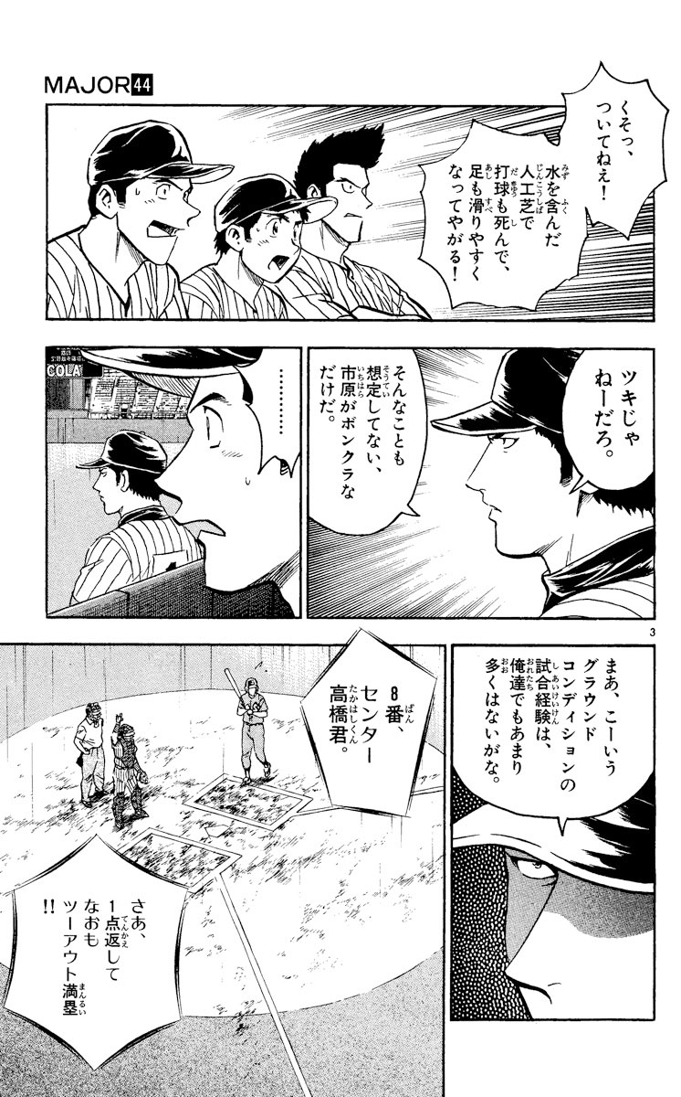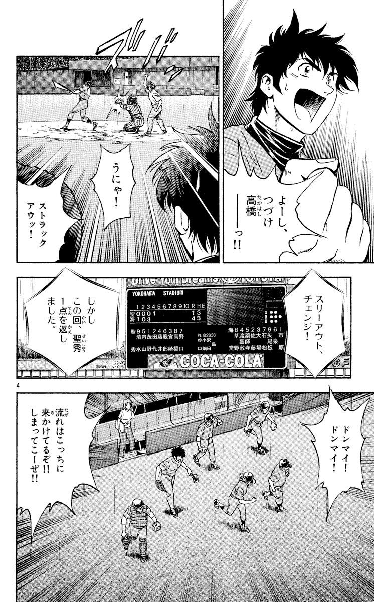 ▼第1話/流れをつかめ!!▼第2話/好機(チャンス)到来!?▼第3話/好運!?▼第4話/突然の乱調!?▼第5話/吾郎の試み▼第6話/俺達の聖秀(チーム)▼第7話/真っ向勝負▼第8話/何球目だ!?▼第9話/助かった▼第10話/悪い流れ●主な登場人物/茂野吾郎(名門・海堂高校から、野球部のない私立聖秀学院に編入。経験者は数人しかいない野球部を作り、再びゼロから甲子園を目指す)●あらすじ/夏の甲子園を目指しての神奈川県予選準々決勝。海堂と対戦している聖秀学院は、3回裏を終わって0対4とリードされる苦しい展開だ。だが雨による中断の後、再開された4回表に、聖秀は宮崎の内野安打で1点を返す。「これ以上点を取られたら、即降板」と江頭に告げられた海堂の先発・市原は気合を入れなおすが、聖秀は5回表にも先頭の大河がヒットで出塁して…(第1話)。●本巻の特徴/いくつかのラッキーも重なり、聖秀はさらに2点を返し、1点差にまで追いすがる。ここで遂に市原は降板。海堂は2番手に、サウスポーでナックルを武器にする阿久津を送った。そして試合は、1点を巡る中盤の息詰まる攻防に入っていく。●その他の登場人物/佐藤寿也(海堂の天才捕手。吾郎の初めての野球友達で、かつては吾郎とバッテリーを組んでいた)、江頭哲文(海堂高校野球部チーフマネージャー。別名監督代行で、海堂の実質ナンバー2)、清水大河(リトルリーグ、シニアリーグで5年間レギュラーだった実力派。聖秀に入学しショートを守る)、田代(父親に野球を禁止されてやる気をなくしていたが、吾郎の姿を見て発奮。キャッチャーをつとめる)、藤井(元はナンパ野郎で野球には興味がなかったが、吾郎の豪球を見て心が動き、本気で取り組みだす。ポジションはセカンド)、清水薫(大河の姉。聖秀ソフトボール部のエース。吾郎の幼なじみ)、中村美保(吾郎に興味を持ち、聖秀野球部の押しかけマネージャーになった巨乳の女の子。薫とは犬猿の仲)