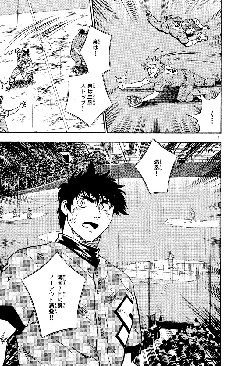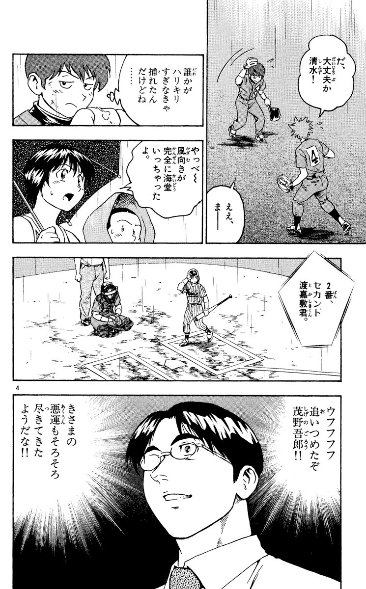 ▼第1話/俺の直球(ボール)▼第2話/闘争本能▼第3話/余力▼第4話/信じたくない▼第5話/負けやしねぇ。▼第6話/この回だ▼第7話/うろたえるな▼第8話/これが眉村か▼第9話/王者の葛藤▼第10話/造反●主な登場人物/茂野吾郎(名門・海堂高校から、野球部のない私立聖秀学院に編入。経験者は数人しかいない野球部を作り、再びゼロから甲子園を目指す)●あらすじ/夏の甲子園を目指しての神奈川県予選準々決勝。聖秀学院は王者・海堂を相手に、7回表を終わって4対4と大健闘。だが7回裏、流れは海堂に傾き、吾郎は無死満塁のピンチを迎えてしまう。打席には器用な2番打者・渡嘉敷。当然スクイズが考えられる場面なので、田代はとりあえず外して様子を見ようとする。だが吾郎は真っ向勝負を選択。渾身のストレートを投げ込むことにした。初級はストライク。そして2球目、海堂は予想通りスクイズを仕掛けてくるが…!?(第1話)●本巻の特徴/なんとか7回裏のピンチを切り抜けた聖秀。そして9回表、大河のタイムリーツーベースで遂に1点を勝ち越した。海堂はエース・眉村をマウンドに送り、これ以上の追加点は阻止するも予選敗退のピンチに。だが迎えたその裏、吾郎はここまでなんとか耐えてきた足の痛みが限界にきてしまい、それに気付いた江頭は…!?●その他の登場人物/清水大河(リトルリーグ、シニアリーグで5年間レギュラーだった実力派。聖秀に入学しショートを守る)、田代(父親に野球を禁止されてやる気をなくしていたが、吾郎の姿を見て発奮。キャッチャーをつとめる)、佐藤寿也(海堂の天才捕手。吾郎の初めての野球友達で、かつては吾郎とバッテリーを組んでいた)、江頭哲文(海堂高校野球部チーフマネージャー。別名監督代行で、海堂の実質ナンバー2。勝つためには手段を選ばない非情な指揮官)、清水薫(大河の姉で、聖秀ソフトボール部のエース。吾郎の幼なじみ)
