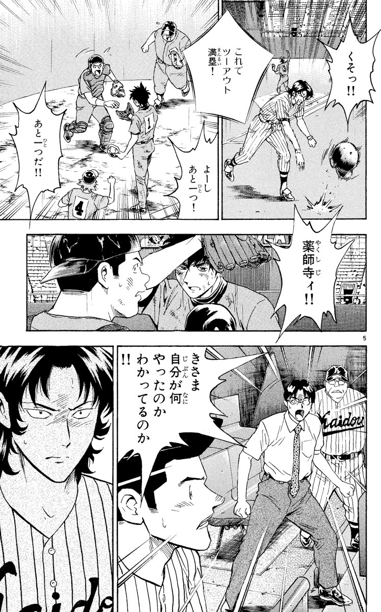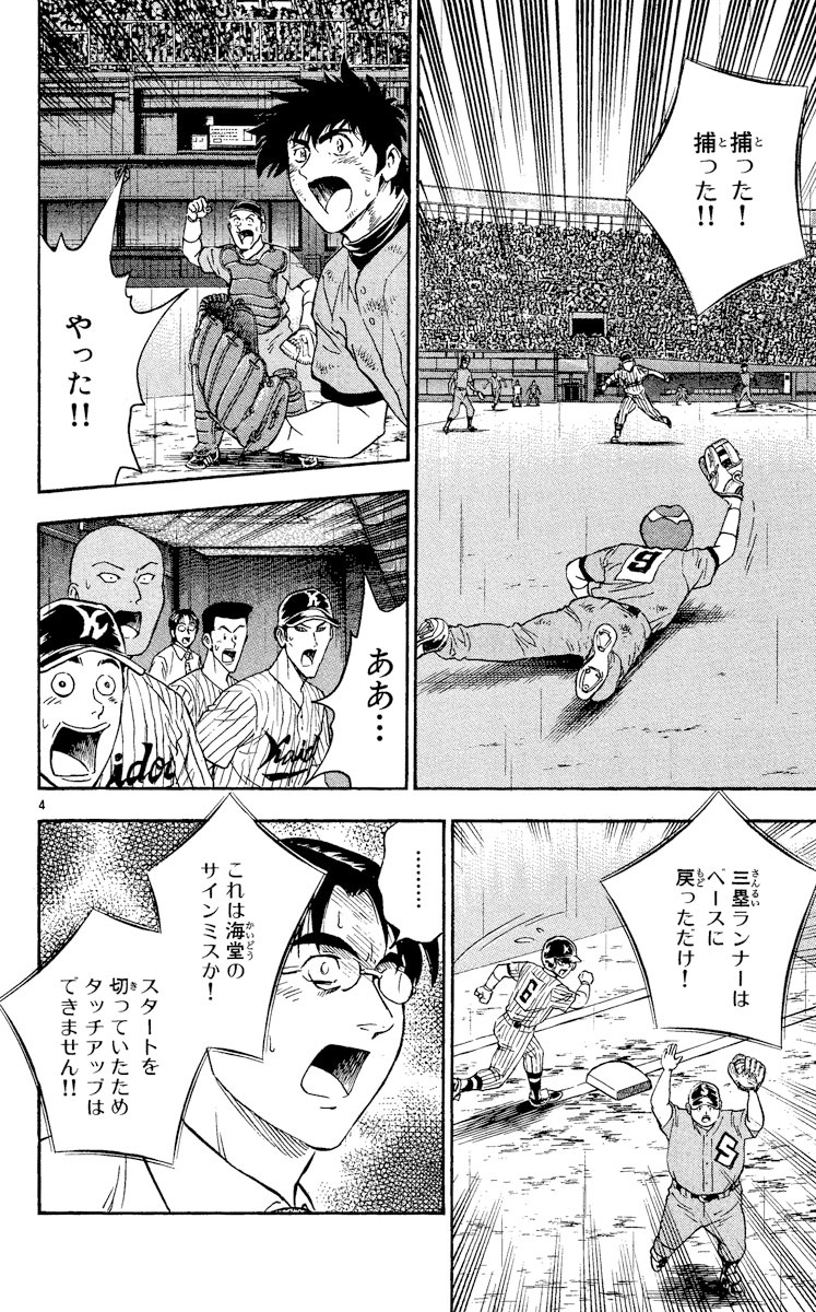 ▼第1話/決めてこい!▼第2話/お願いおとさん▼第3話/策謀の果て▼第4話/どでかい山▼第5話/見届けるよ▼第6話/傷だらけのエース▼第7話/乾坤一擲(けんこんいってき)▼第8話/雨上がりの決戦▼第9話/死闘の結末▼第10話/戻ってきなよ!!●主な登場人物/茂野吾郎(名門・海堂高校から、野球部のない私立聖秀学院に編入。経験者は数人しかいない野球部を作り、再びゼロから甲子園を目指す)●あらすじ/神奈川県予選準々決勝。吾郎たち聖秀学院は海堂を相手に、9回表ついに逆転に成功した! しかし9回裏、またも江頭のバント作戦で一死満塁のピンチを迎えてしまう。だが江頭の卑劣なやり方に反発した三番打者・薬師寺は、バントの指示を無視しバットを振りぬいた。結果はライトフライで、三塁ランナーもスタートを切っていたためタッチアップできない。佐藤・眉村に続く造反に、とうとう江頭がキレた…!?(第1話)●本巻の特徴/聖秀学院と海堂の対決、いよいよクライマックス! 試合は延長戦に突入し、限界がきているはずの吾郎の足は、どこまで持ち応えられるのか!? さらに、海堂側のベンチでは卑怯な行為の限りをしつくした江頭に正義の鉄槌が下される時がくる!! 両チームが死力を尽くした試合の結末を描く第46集。●その他の登場人物/清水大河(リトルリーグ、シニアリーグで5年間レギュラーだった実力派。聖秀に入学しショートを守る)、田代(父親に野球を禁止されてやる気をなくしていたが、吾郎の姿を見て発奮。キャッチャーをつとめる)、佐藤寿也(海堂の天才捕手。吾郎の初めての野球友達で、かつては吾郎とバッテリーを組んでいた)、江頭哲文(海堂高校野球部チーフマネージャー。別名監督代行で、海堂の実質ナンバー2。勝つためには手段を選ばない非情な指揮官)、清水薫(大河の姉で、聖秀ソフトボール部のエース。吾郎の幼なじみ)