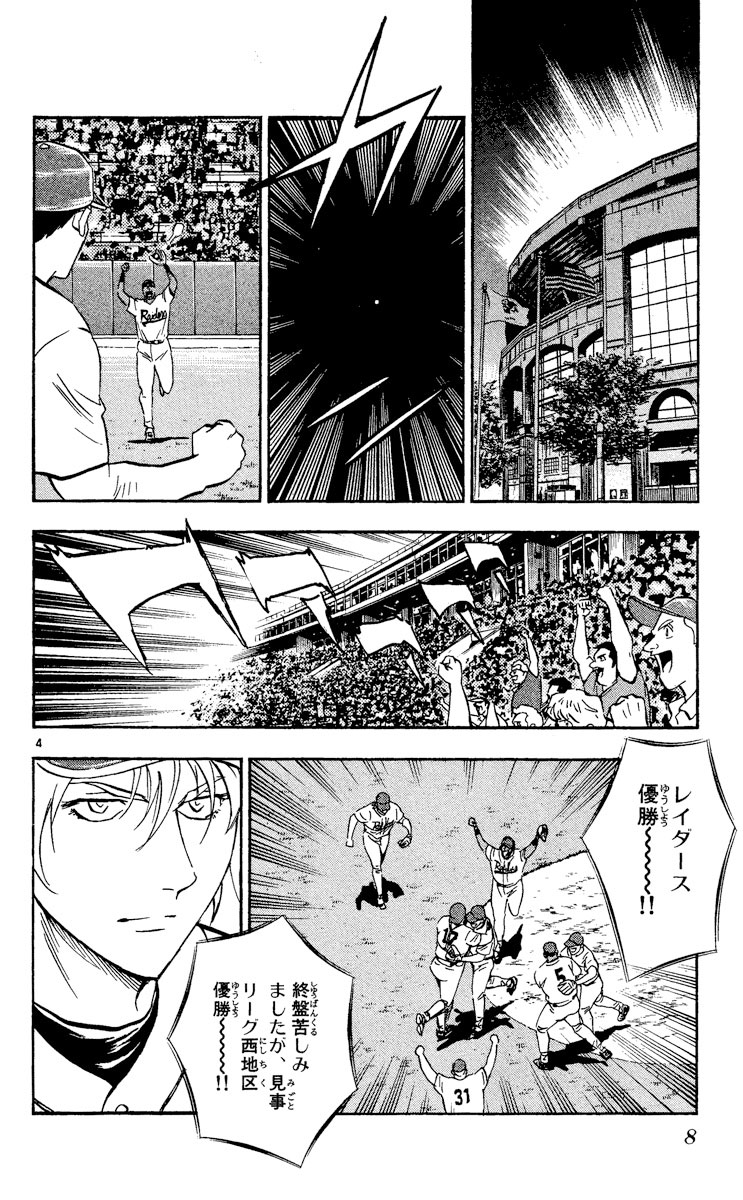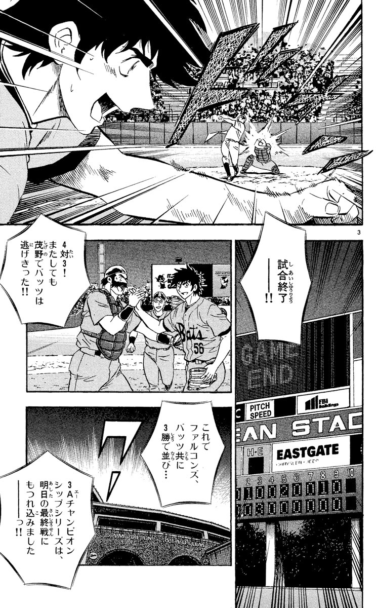 ▼第1話/再戦▼第2話/眼差し▼第3話/ギブソンの予言▼第4話/セオリーよりも▼第5話/偉大な男▼第6話/本物の好敵手▼第7話/不完全燃焼▼第8話/振り出し▼第9話/あと一人▼第10話/成長の証●主な登場人物/茂野吾郎(豪速球を武器とする生粋のピッチャー。高校卒業後、アメリカに渡りメジャーを目指す)●あらすじ/3Aチャンピオンシップシリーズ、バッツ対ファルコンズ。セットアッパー・吾郎の活躍で3勝3敗に持ち込んだバッツに対し、ファルコンズにはメジャーへ昇格していたギブソンJr.がカムバックしてきた!! そして迎えた大一番、前回の勝負で吾郎の102マイルに三振を喫したジュニアが、ベンチで控える吾郎の前で特大のホームランを見せつけ…!?(第1話)●本巻の特徴/ジョー・ギブソンの見守る中、吾郎とギブソンJr.が再び対決! 父親が自分よりも吾郎をひいきしていると思い、反発し続けてきたジュニアに対しギブソンは? 一方、吾郎も以前は投げられた100マイルの剛速球が放れず、苦戦を強いられることに…。●その他の登場人物/サンダース(3Aバッツの捕手。強面リーダー)、ギブソンJr.(ジョー・ギブソンの息子。黄金ルーキーといわれる強打者でメジャー昇格を果たす)、ジョー・ギブソン(41歳で300勝を達成した現役メジャー投手。かつて日本球界に在籍中、吾郎の父・本田茂治を投球事故死させる)
