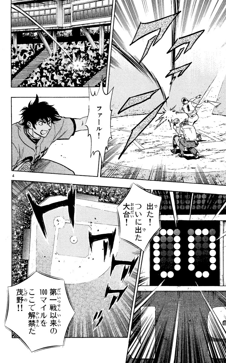 ▼第1話/マキシマム▼第2話/誓い▼第3話/ふたたび▼第4話/好敵手(ライバル)達の時間▼第5話/突然のチャンス▼第6話/なんもわかってない▼第7話/二人の温度差▼第8話/10年目の告白▼第9話/バッティングピッチャー▼第10話/すれ違い●主な登場人物/茂野吾郎(豪速球を武器とする生粋のピッチャー。高校卒業後、アメリカに渡りメジャーを目指す)●あらすじ/3Aチャンピオンをかけた、ファルコンズとのプレーオフ最終戦。10回裏2死、走者2・3塁の場面で、ギブソンJr.の打順を迎えたバッツ・吾郎は、5球目で初戦以来の100マイルを投げ込む! 「窮地にこそマキシマムな能力を発動する」吾郎の実力を認めたギブソンJr.も、これを二球連続ファールで凌ぐ意地を見せ、運命の勝負は第7球目へ…!!(第1話)●本巻の特徴/渡米1年目の闘いを終え、帰国した吾郎に突如もたらされた「野球W杯」開催のニュース! 世界16か国の代表チームが“真の世界一”を懸けて争う夢の大会に、吾郎も日本代表メンバー入りを目指して動き出す! 一方、幼なじみ・薫との関係にもついに進展が…!?●その他の登場人物/サンダース(3Aバッツの捕手。強面リーダー)、ギブソンJr.(ジョー・ギブソンの息子。黄金ルーキーといわれる強打者でメジャー昇格を果たす)、ジョー・ギブソン(41歳で300勝を達成した現役メジャー投手。かつて日本球界に在籍中、吾郎の父・本田茂治を投球事故死させる)、清水薫(ソフトボール部に所属する女子大生。吾郎の幼なじみ)、茂野英毅(吾郎の父親。マリンスターズの投手だった元プロ選手)、茂田桃子(両親を亡くした吾郎を実の子として育てている) 、佐藤寿也(東京シャイアンズの新人捕手。吾郎の初めての野球友達で、かつては吾郎とバッテリーを組んでいた)