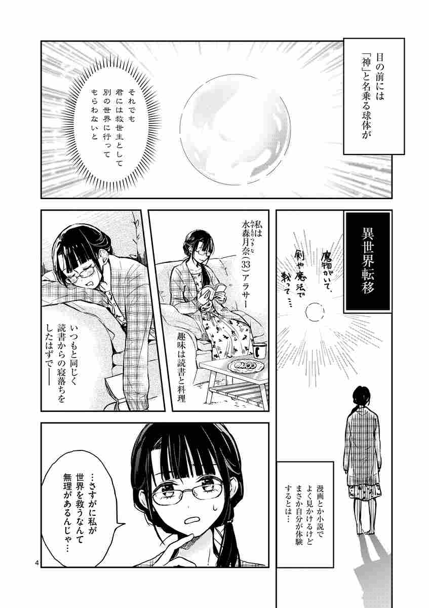 私に世界は救えません!! アラサー女子のツキナは、「神」と自称する球体により、異世界へ喚ばれてしまった。「神」は何でも願いを叶える事と引き替えに、「救世主」として異世界に安定をもたらすよう言ってくるのだけど…。ハイスペックアラサー女子の異世界ラブライフ!