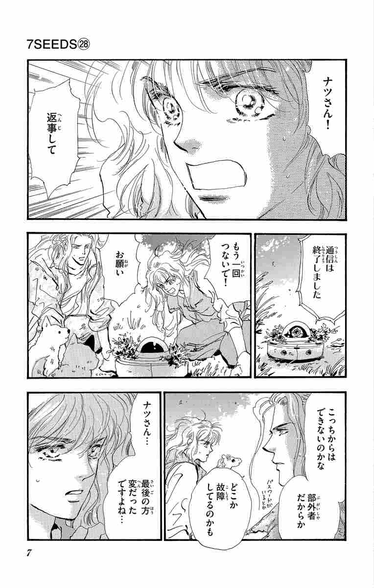 7SEEDSメンバー達が繋がる28巻! 佐渡島にたどりついた花たちは、残されていたお掃除ロボットを通じて地下のナツと初めてコンタクトを取る。しかしナツは意識を失い、彼女を助けようと花と新巻は地下におりてゆく。