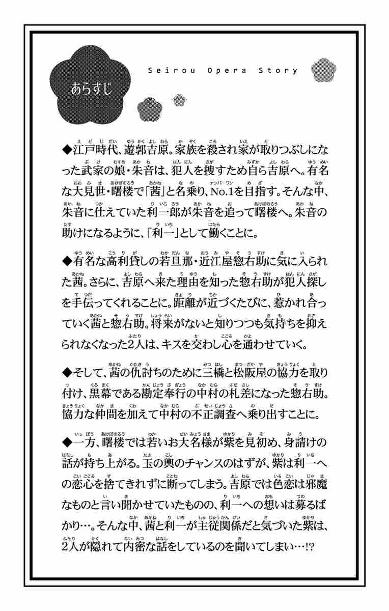 朱音たちの前に現れた真木村、敵か味方か… 道中で病で倒れた禿(かむろ)たちのために、医者の真木村(まきむら)を手配した朝明野(あさけの)。軽薄な印象の真木村だがその裏に隠された謎とは・・・。勘定奉行・中村との対決はいよいよ佳境を迎え、物語は大きく動き出す!