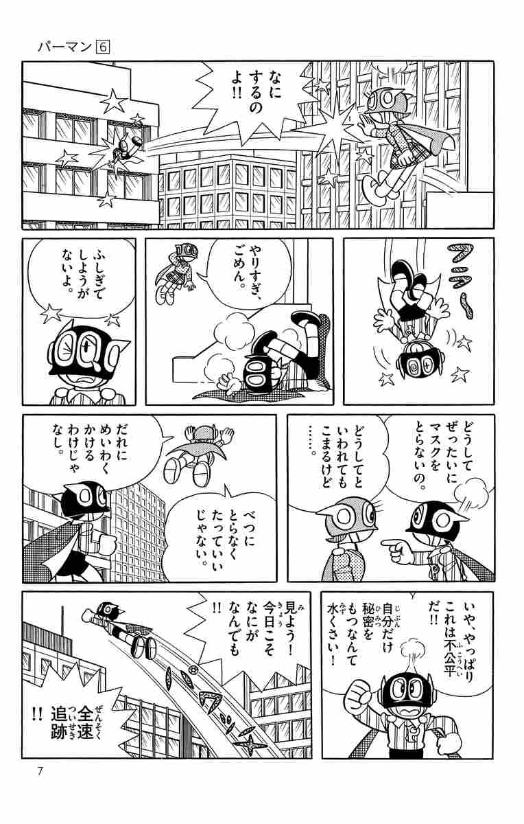 その第6巻は、パーマン1号の弱点が明らかになる「ゴキブリこわい」や、パーやんの実家(お寺)と運送業の秘密があきらかになる「パーやん運送でアルバイト」など、主要メンバーの「秘密」に迫るエピソードが見どころの巻。