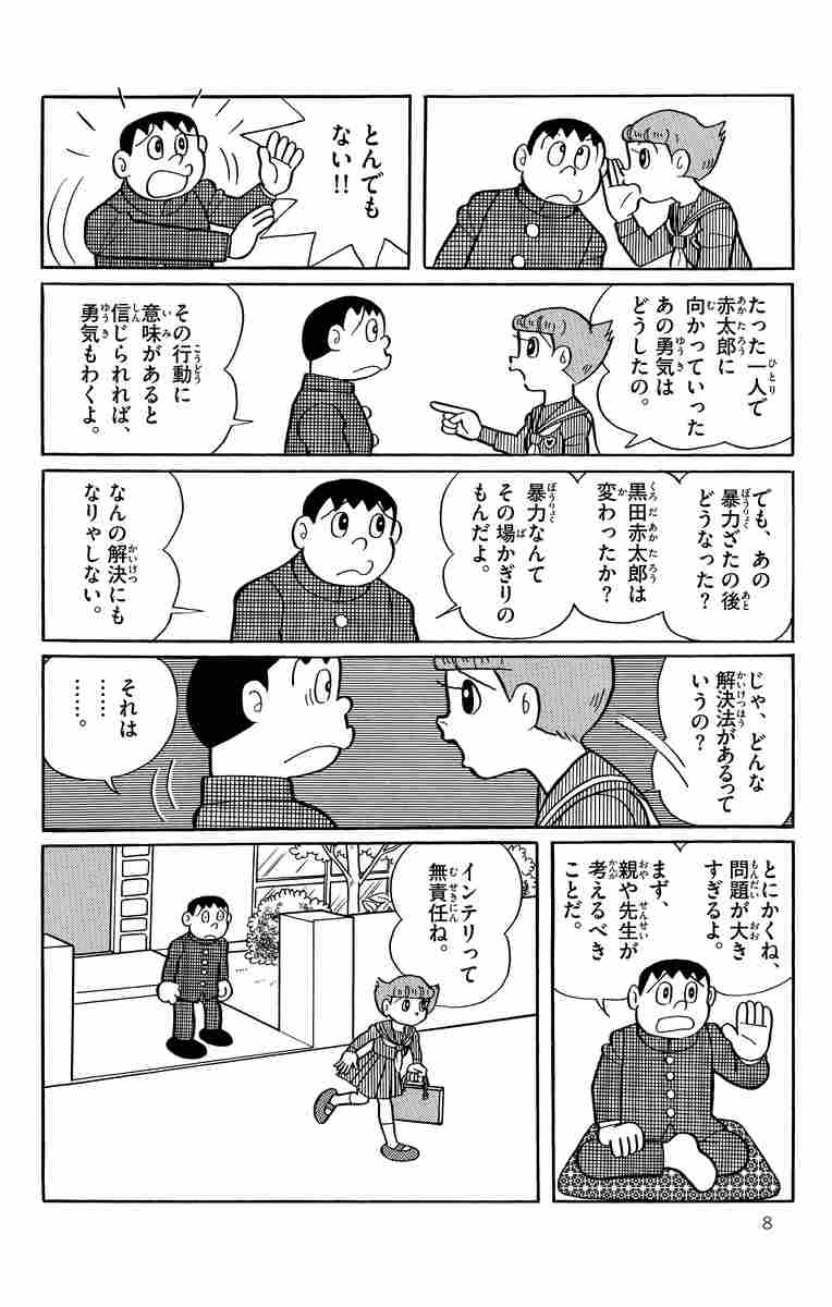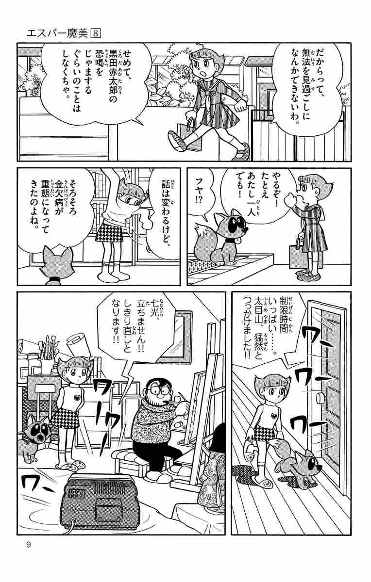 5巻「学園暗黒地帯」で大あばれした赤太郎が帰ってきて再び波乱の予感!? 「若い女性がパパのところに…!?」魔美のモデル業に「ショーバイがたき」が出現!? など、魔美の周りの人間模様も少しずつ成長・変化して行きます。全9巻の「エスパー魔美」もそろそろ大詰め。じっくり味わってください。