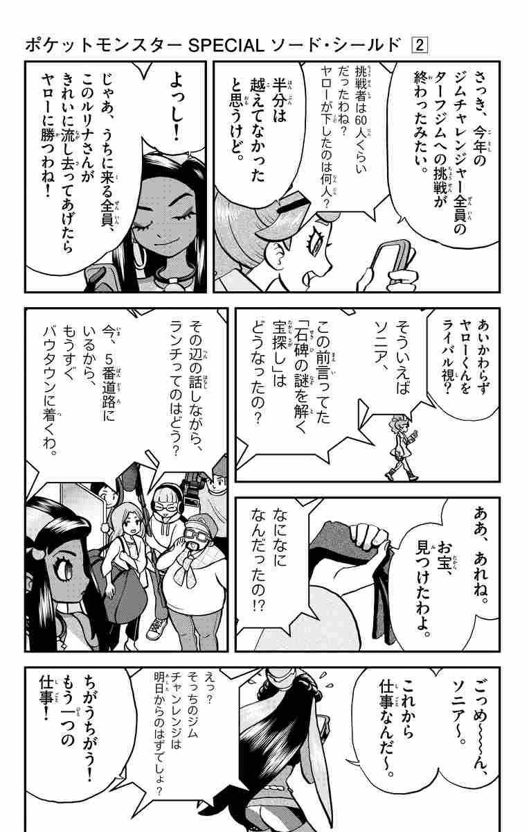 初のキョダイマックス戦!宝物庫の謎とは? バウスタジアムでのジムチャレンジで剣創人は初めてのキョダイマックス戦に挑む! 一方、盾シルドミリアははぐれた手持ちポケモンの1匹と再会! 互いに成長を続けながらガラル地方の謎に迫る第2巻!