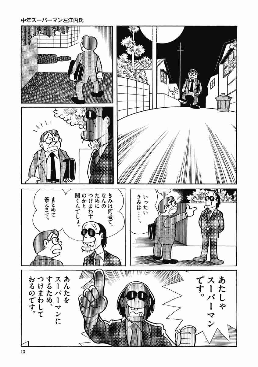 大人向け連載の2大傑作を豪華カップリング さえない中年男がある日突然スーパーマンに!? 落ち目の熟年漫画家が若き日の自分にタイムスリップ!? 藤子・F・不二雄の作品群では他に例のない大人向けの連載作品「中年スーパーマン左江内氏」と「未来の想い出」を、ぜいたくに1冊にまとめてお届けします。『週刊漫画アクション』、『ビッグコミック』掲載作品。(解説/本多健治)