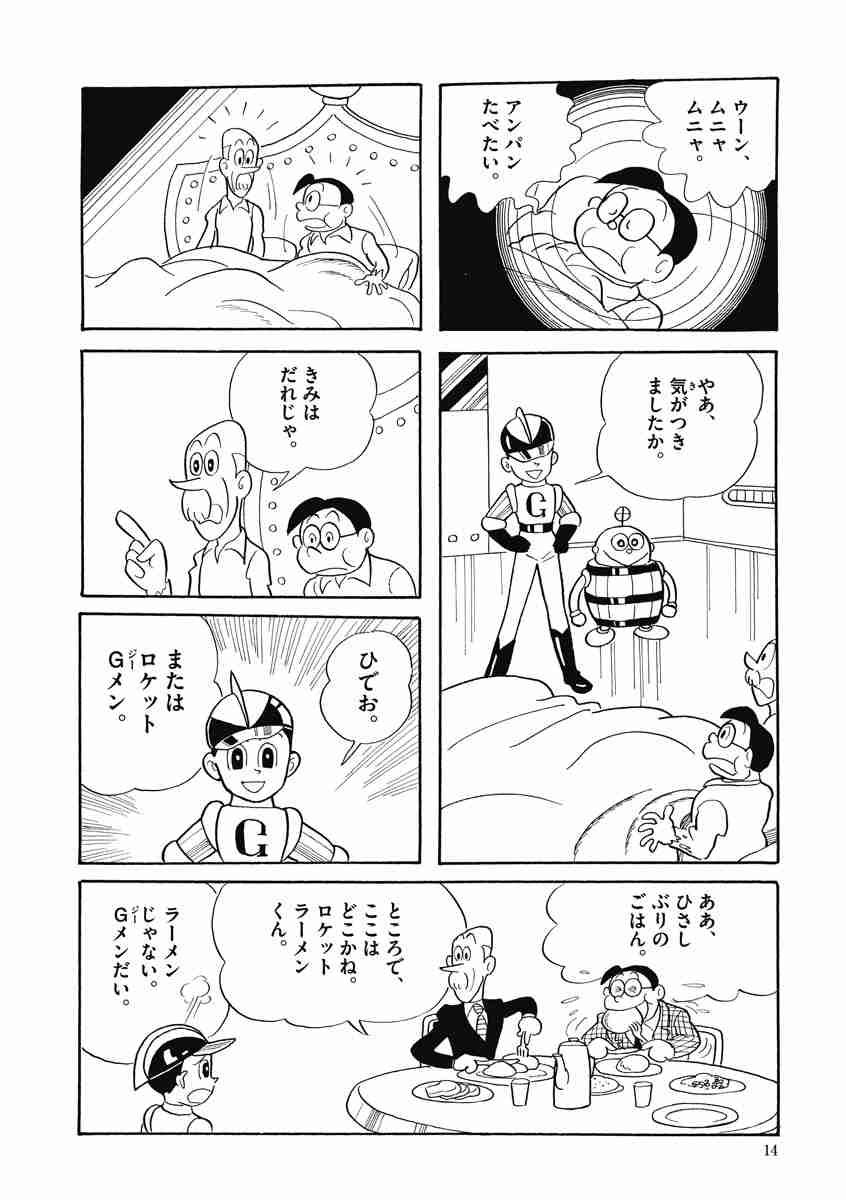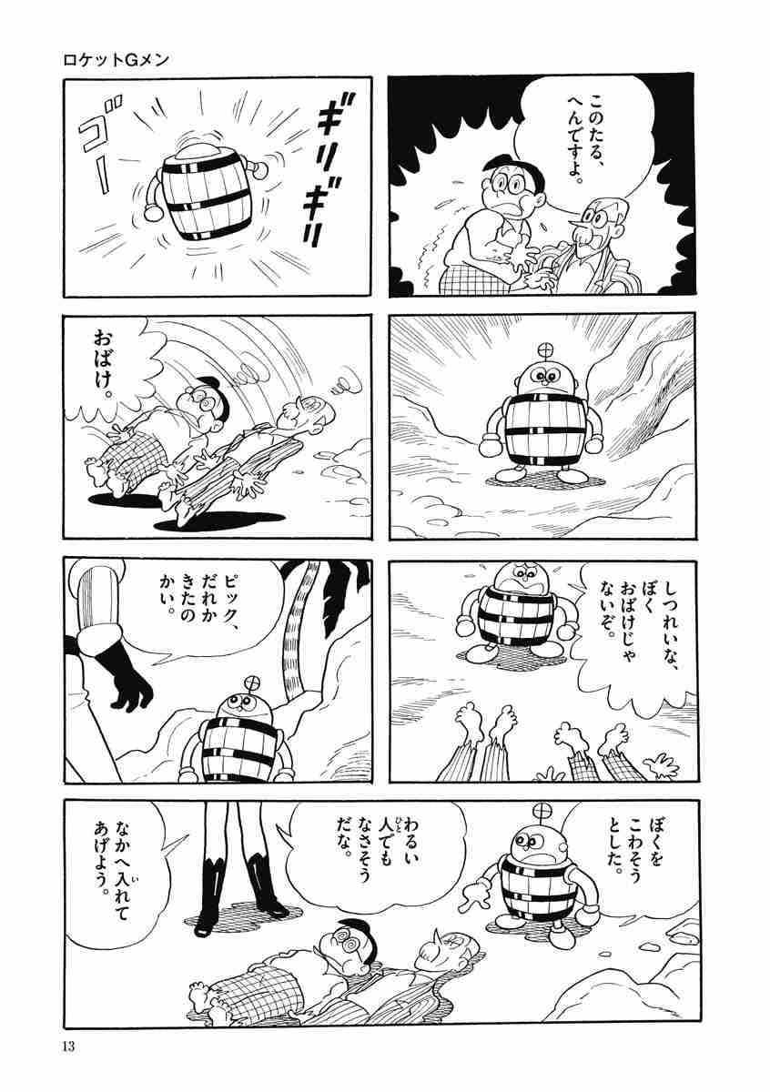 「ロボケット」同時期の大スケールSF活劇 分離・合体自由自在の万能ロケット「アロー号」に、相棒ロボット「ピック」を乗せ、世界を乱す敵と戦う正義の少年「ロケットGメン」。1話が2ヶ月以上にわたって連載されるスタイルは「海の王子」の壮大なスケールを思わせ、また、相棒ロボットとの軽妙なコンビネーションに「すすめロボケット」のゆかいさも感じさせる、少年SFヒーローの知られざる傑作です。ピックのデザインには「キテレツ大百科」のコロ助も予感させます。