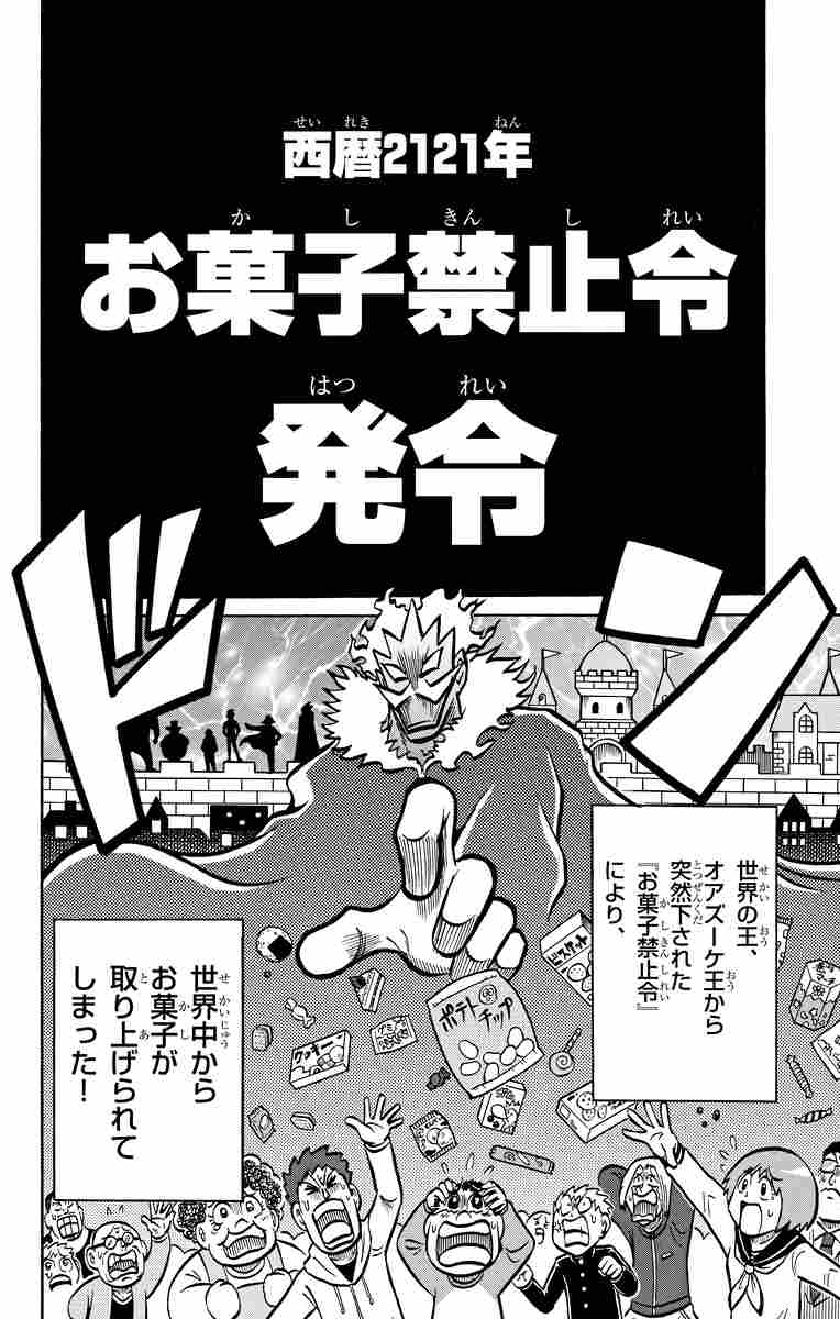 お菓子な世界をぶっ壊せ!! 西暦2121年、オアズーケ王が突如出した「お菓子禁止令」によって、お菓子が食べられなくなった世界で、お菓子を人々に取り戻すために主人公・鐘木チョコが戦うお菓子なバトル物語! チョコ・ガム・ポップコーンなど様々なカッコ良くて、面白いお菓子能力者がでてくるぞ!「ウソツキ! ゴクオーくん」の作者・吉もと誠先生による最新作を今すぐ読もう!!!