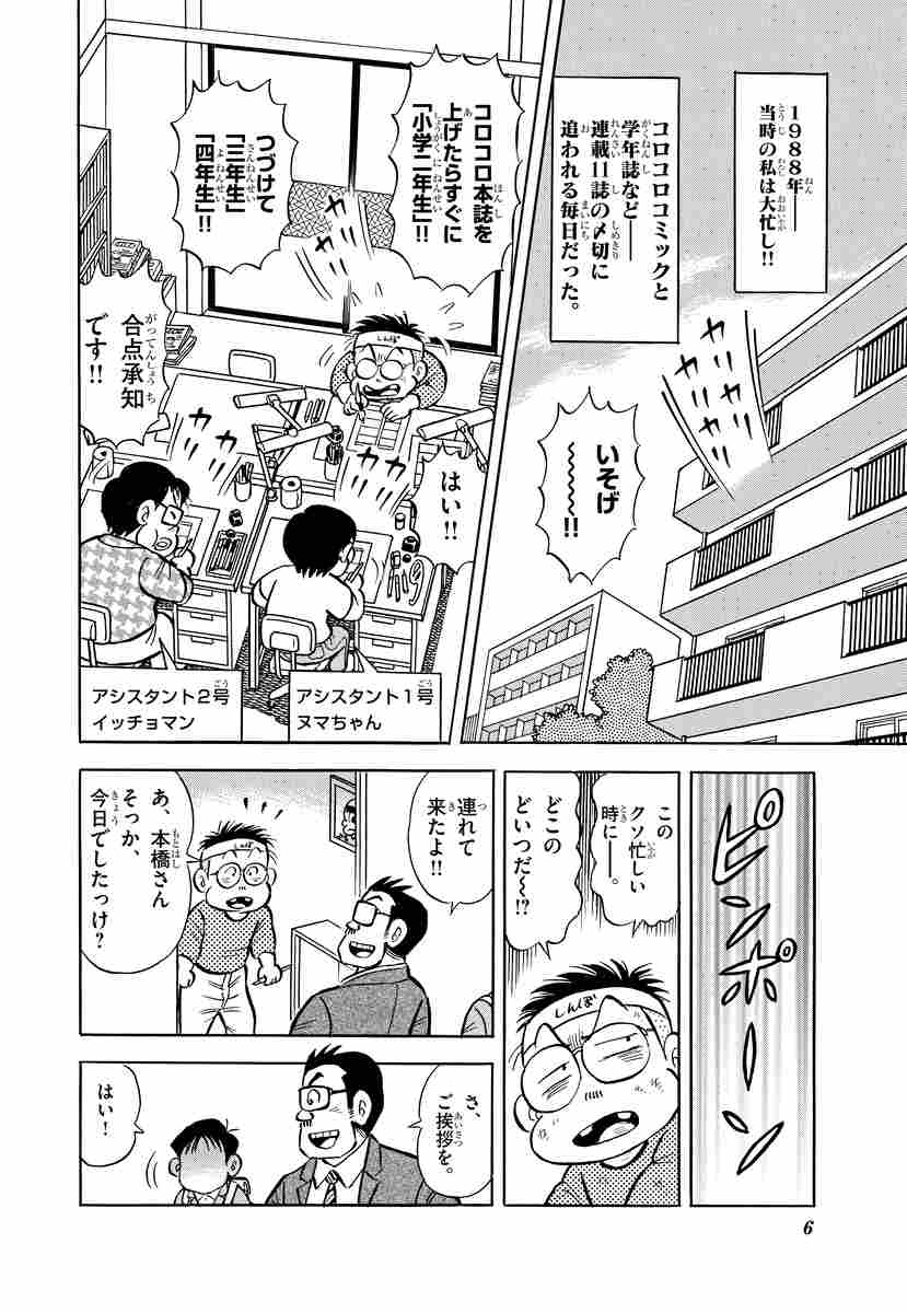 本書は以前に発売されたコミックス4・5・6巻の内容580ページを1冊にまとめた上で、誌面をコロコロと同サイズに拡大し、描きおろし「つるセコ返済伝説」を追加した大サービスの合本版だ!! 熱すぎる伝説満載、買ってくれ~っ!!