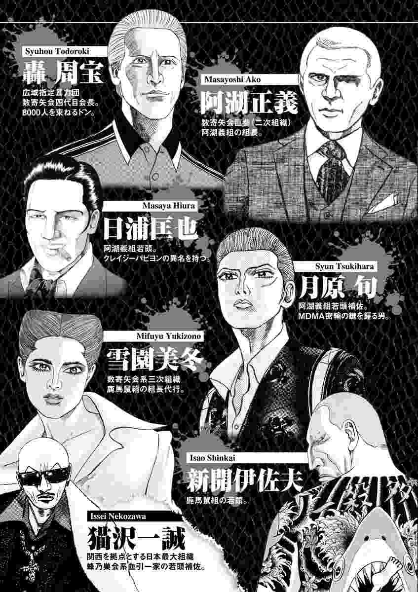 ●その他の登場人物/月原旬(阿湖義組若頭補佐。MDMA密輸の秘密を握る男)、雪園美冬(数寄矢会系三次組織・鹿馬鼠組の組長代行)、新開伊佐夫(鹿馬鼠組若頭)、山田竜平(玲二の舎弟。元は雛豆組組員)、赤桐一美(玲二の専属養成係。表の顔は谷袋署資料整理室整理係)、轟周宝(広域指定暴力団・数寄矢会会長。8000人を束ねるドン)