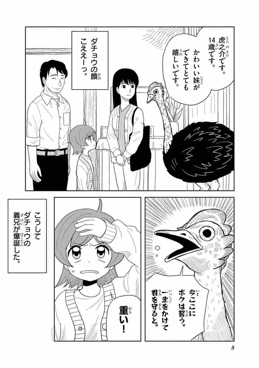 新たにできた義兄は、まさかのダチョウ!? 主人公・明美は父親の再婚で新たに義理のお兄ちゃんが出来ることに。だが、その兄が・・・まさかのダチョウだった!?