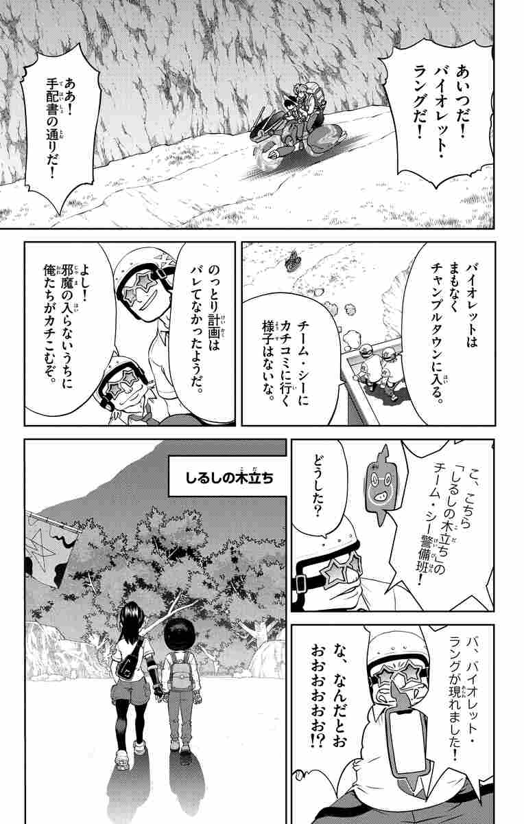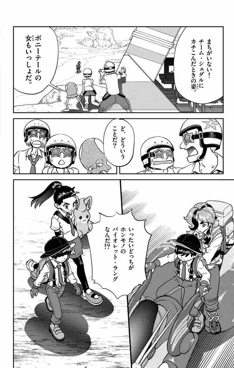 いざ!カチコミ!対決!土震のヌシ! スカーレット&ネモはスター団どく組へカチコミ!そして明らかになる、スター団結成の秘密…。一方、バイオレット&ペパーは、土震のヌシを倒して、秘伝スパイスを手に入れるため、チャンプルタウンを訪れるが…?バトルは激しく!物語はさらに加速してゆく…!