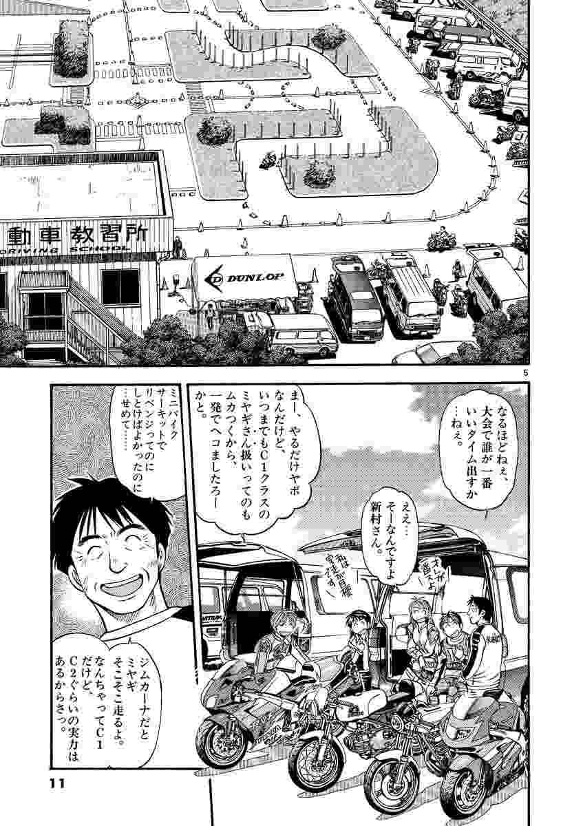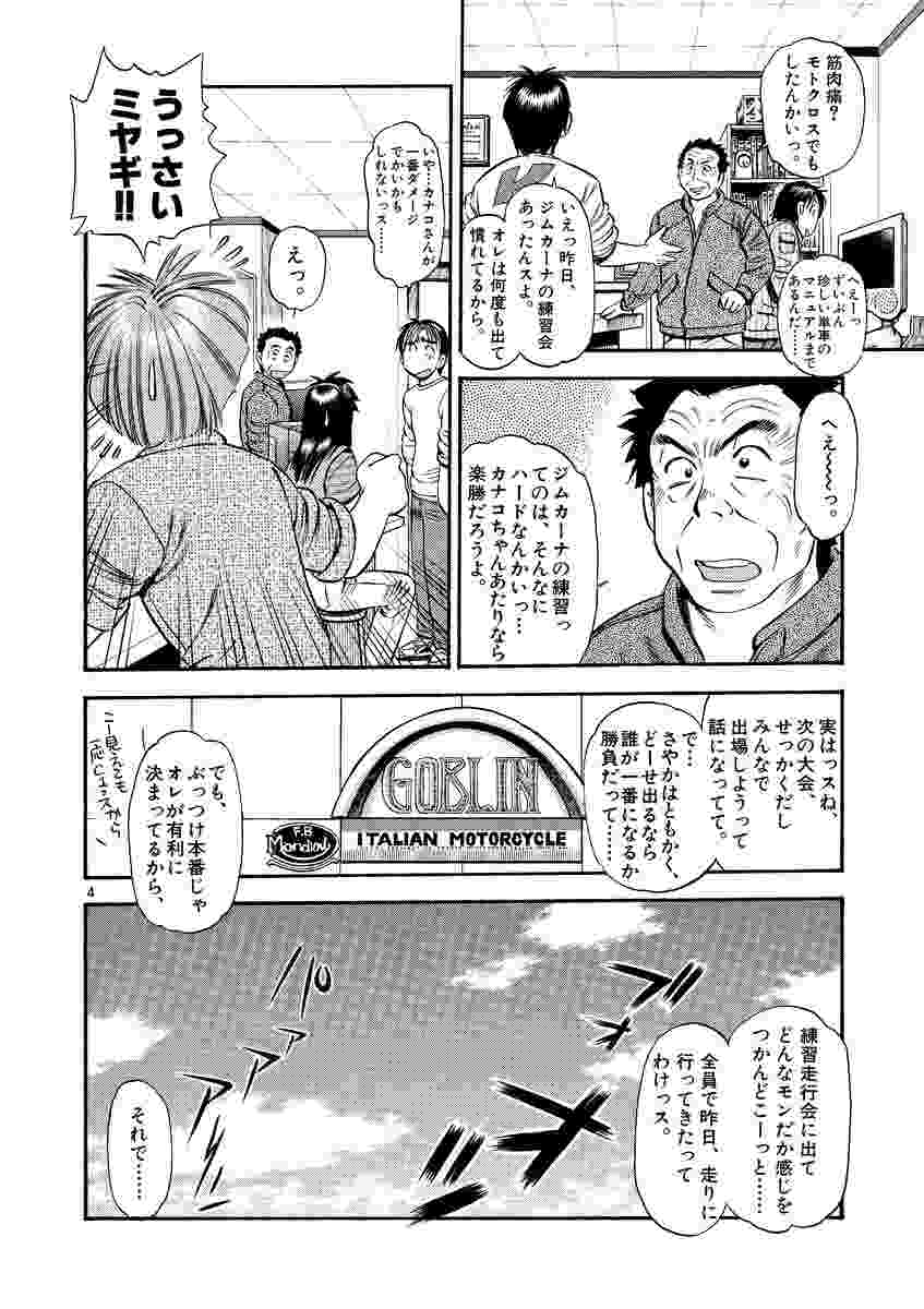 ▼第25~29話/ジムカーナ (1~5)▼第30話/スクーター●主な登場人物/宮城進武(バイク便ライダーをしている19歳。愛車は仕事用がカワサキZZR1100、プライベート用がカワサキZX6R。レナにホレている)、滝沢レナ(主にイタリアの旧車を扱うバイクショップ「ゴブリン」の店主。宮城が住むマンションの大家の娘で、ルックスは抜群だが男勝りの単車乗り。年齢不詳)●あらすじ/宮城やレナたちが、二輪レースのひとつ「ジムカーナ」に出場することに。すでに何度もレースを経験してC1級にランクされている宮城に対し、女性陣は今回が初参加。だが、一発B級昇格を宣言しているカナコは、A級・新村のコーチも受けることになってヤル気満々! 一方、新顔の客にイタリアの中古スクーター(現状はクズ鉄)のレストアを頼まれたレナは、レースどころじゃなくなると思いきや…(第25話)。●本巻の特徴/なりゆきでキスを賭けての勝負となった宮城とレナ。女2人に「問題外」呼ばわりされた宮城は男を見せられるのか? 持ち込まれた中古イタ車が、実は世界で2台きりの超レア物と判明する「スクーター」を含む、全2編6話を収録。●その他の登場人物/安達カナコ(レナの高校時代からのバイク仲間。かつて「レナカナ」といえば、峠では知られた走り屋コンビだった。愛車はホンダRVFとヤマハTMAX。既婚)、宮城さやか(宮城の妹。短大生。愛車は「GOBLIN」で買ったパリラGSとアスペス・ユーマ)、城戸(イタ車マニアの青年。レナの店に、謎の掘り出し物スクーターのレストア依頼に来た)