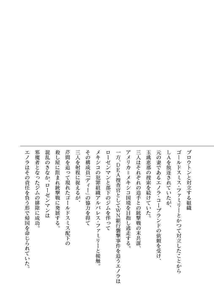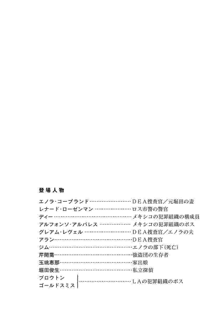 ●その他の登場人物/エノラ・コープランド(DEA捜査官。堀田のかつての妻)、グレアム・レヴェル(DEA調査官。エノラの現夫)、ブロウトン(LAの犯罪組織のボス)、ゴールドスミス(ブロウトンに敵対する犯罪組織のボス)、レナード・ローゼンマン(ブロウトンファミリーに雇われたロス市警の悪徳刑事)、ディエゴ(通称・ディー。メキシコの犯罪組織の構成員で、殺し屋兼情報屋)、グレアム・レヴェル(DEA調査官。エノラの現夫)、アラン(コープランドの部下)