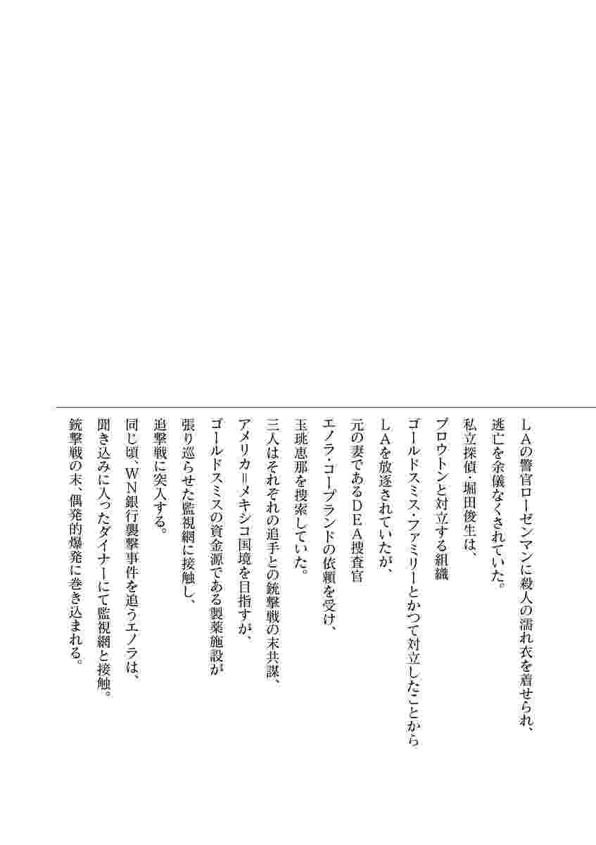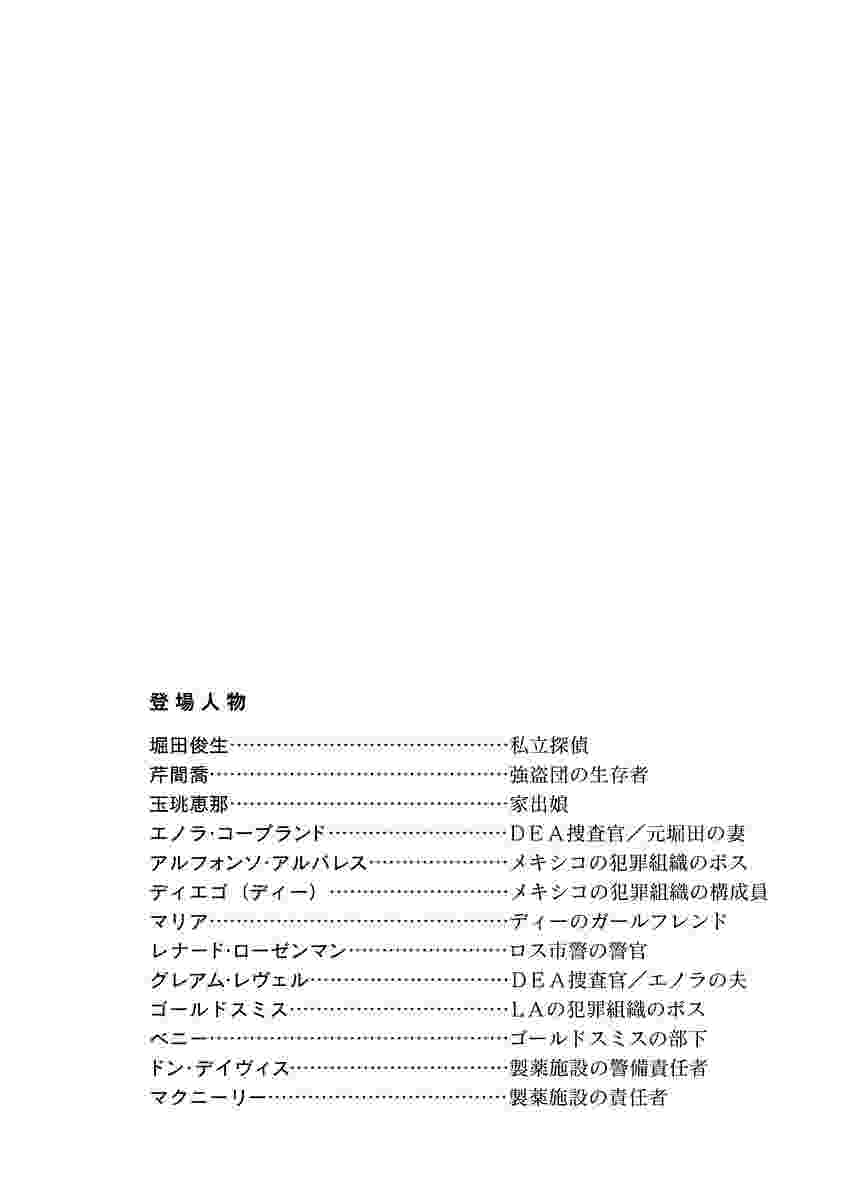 ●その他の登場人物/エノラ・コープランド(DEA捜査官。堀田のかつての妻)、アルフォンソ・アルバレス(メキシコの犯罪組織のボス)、ディエゴ(通称・ディー。メキシコの犯罪組織の構成員で、殺し屋兼情報屋)、マリア(ディーのガールフレンド)、レナード・ローゼンマン(ブロウトンファミリーに雇われたロス市警の悪徳刑事)、グレアム・レヴェル(DEA調査官。エノラの現夫)、ゴールドスミス(ブロウトンに敵対する犯罪組織のボス)、ベニー(ゴールドスミスの部下)、ドン・デイヴィス(製薬会社の警備責任者)、マクニーリー(製薬施設の責任者)