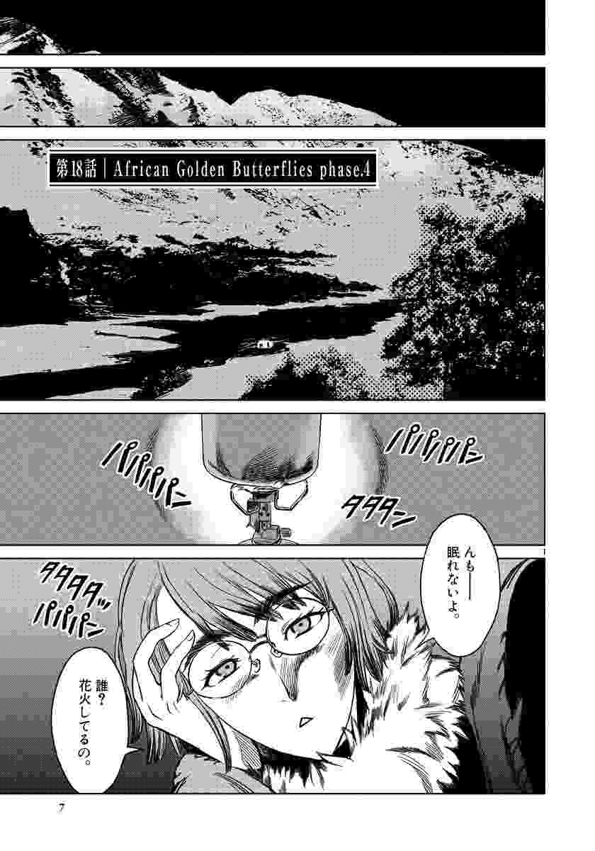 ●あらすじ/幻の蝶を求めて雪山入りした日本人科学者・天田南。ロボット技術の権威である彼女は、自身の研究が武器に転用されることを憂いていたが、武器商人の中でもココに対しては特別な思い入れがあるようだった。彼女をめぐり、ココと中国人武器商人・陳が一見穏やかな腹の探り合いをする一方、山中では互いの部隊が激しい戦闘を繰り広げていた。陳の部隊を率いるカレンに仇の面影を見たバルメが一騎打ちをしかける中、ヨナは敵の部隊の弱点に気付き…(第18話)。