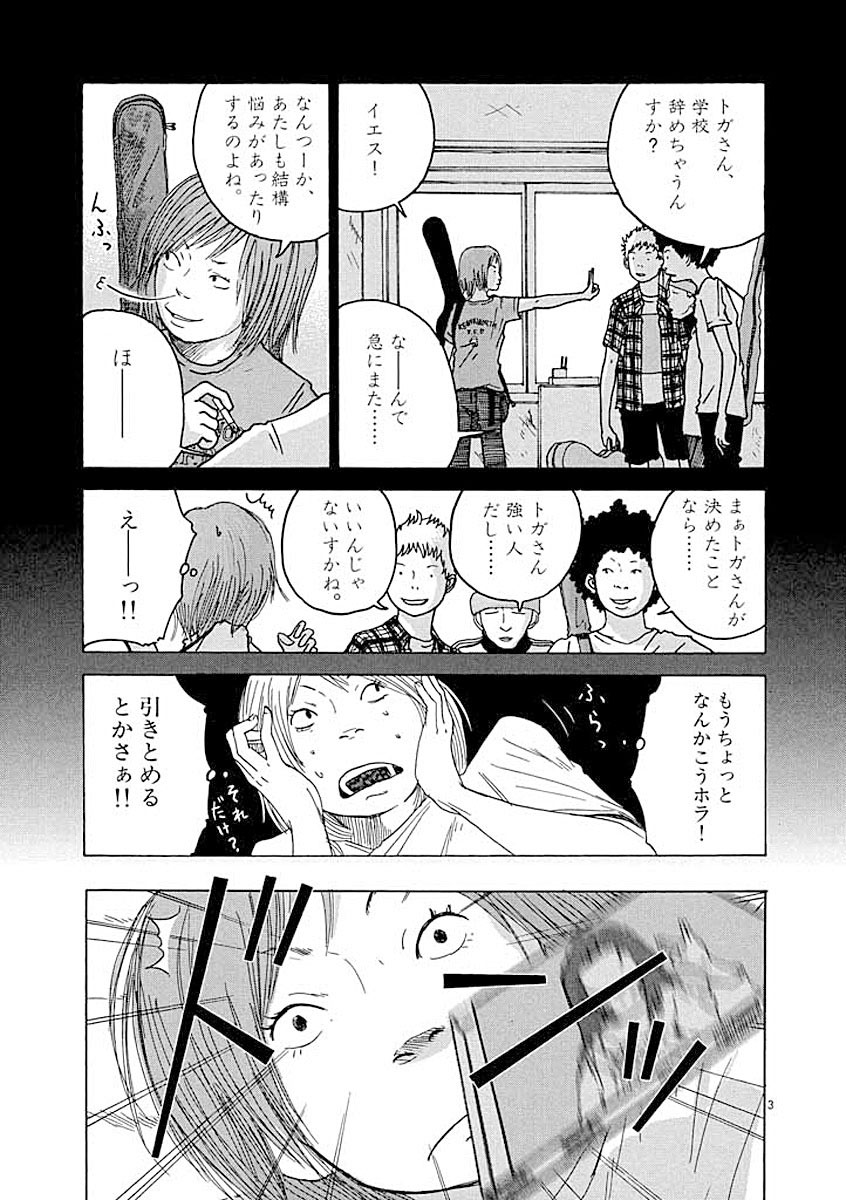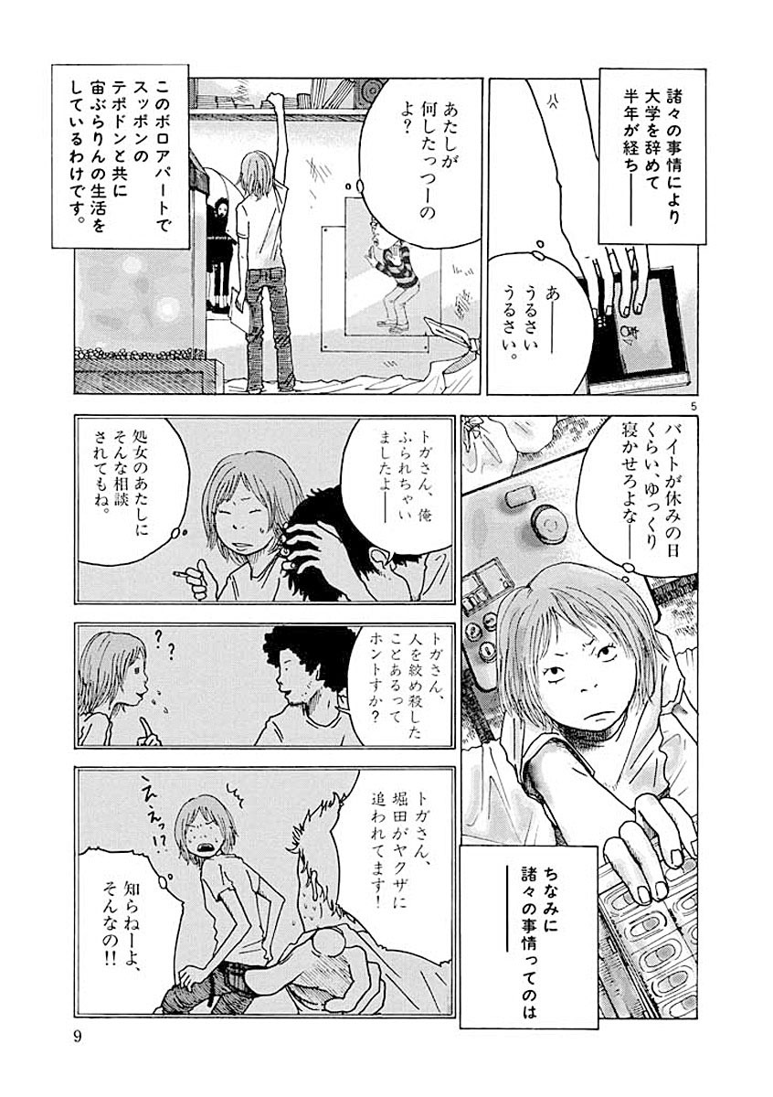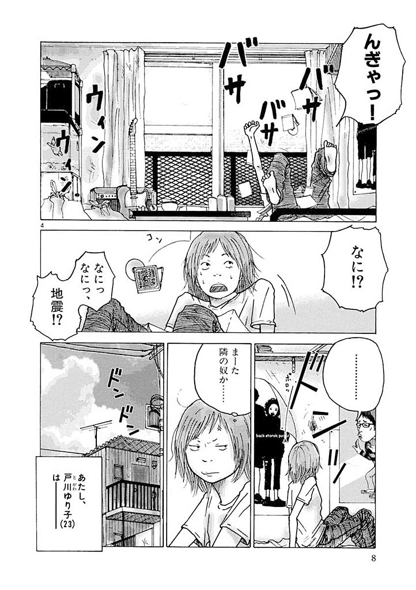 ▼第1話/脱兎さん▼第2話/坂の多い街▼第3話/森のクマさん▼第4話/ワンダーフォーゲル▼第5話/白い星、黒い星▼第6話/サンデー・ピープル▼第7話/mini grammer▼第8話/Untitled▼第9話/シロップ●あらすじ/戸川ゆり子、23歳。大学の音楽サークルで、バンドのボーカルとギターを担当している。カラッとした性格の彼女は、後輩の男の子たちに慕われる人気者。だがその頼られまくりの状況がイヤになり、あっさり大学を辞めてしまった。かといって、その後の生活のあてはない。半年後、久しぶりに出掛けた商店街のライブハウスはつぶれており、そこで偶然再会した以前のバンド仲間・藤井も金髪・ツンツンのパンクヘアーを、ごく普通の髪形にして就職活動をしていた。さらにアパートに帰ると、なんと火事で丸焼け。24万円したギターもアンプも、通帳も印鑑も全部灰になってしまった。土手に寝ころがって呆然とするゆり子。そんな彼女の前に、ゆり子を心配して探しに来た藤井がやって来た…(第1話)。●本巻の特徴/あてもなく大学を中退してしまったバンドの女性ボーカリスト、ひどいいじめを受けている小学生の女の子とカラスの姿をした死に神、組の金に手をつけて逃走中の暴力団員と女子高生、バンドをやめて普通のサラリーマンになった青年、表と裏の顔を持つ歪んだ性格の生徒会長、35歳・妻子に逃げられた売れないマンガ家、恋人と別れたばかりのOL、倦怠期のカップル、勉強しない予備校生…。心のどこかに不安や不満を抱える様々な登場人物たちの日常のドラマをリアルに描く第1集。各回の登場人物が以降の話にほんの少しずつリンクしていく形で進んでいく、ちょっと変わった形式の短編集。