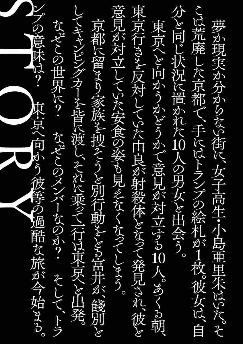 「げぇむすたあと」の声がする。 廃墟と化した京都で目覚めた11人の男女。トランプの絵札を持たされた彼らは東京を目指すかどうかで分裂、1人が殺され、1人が消え、1人は残ることになった。