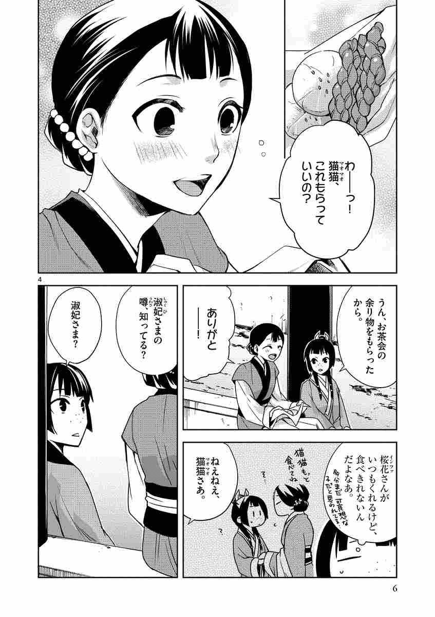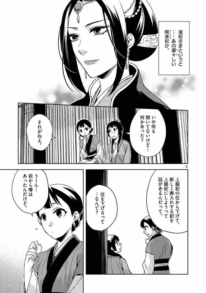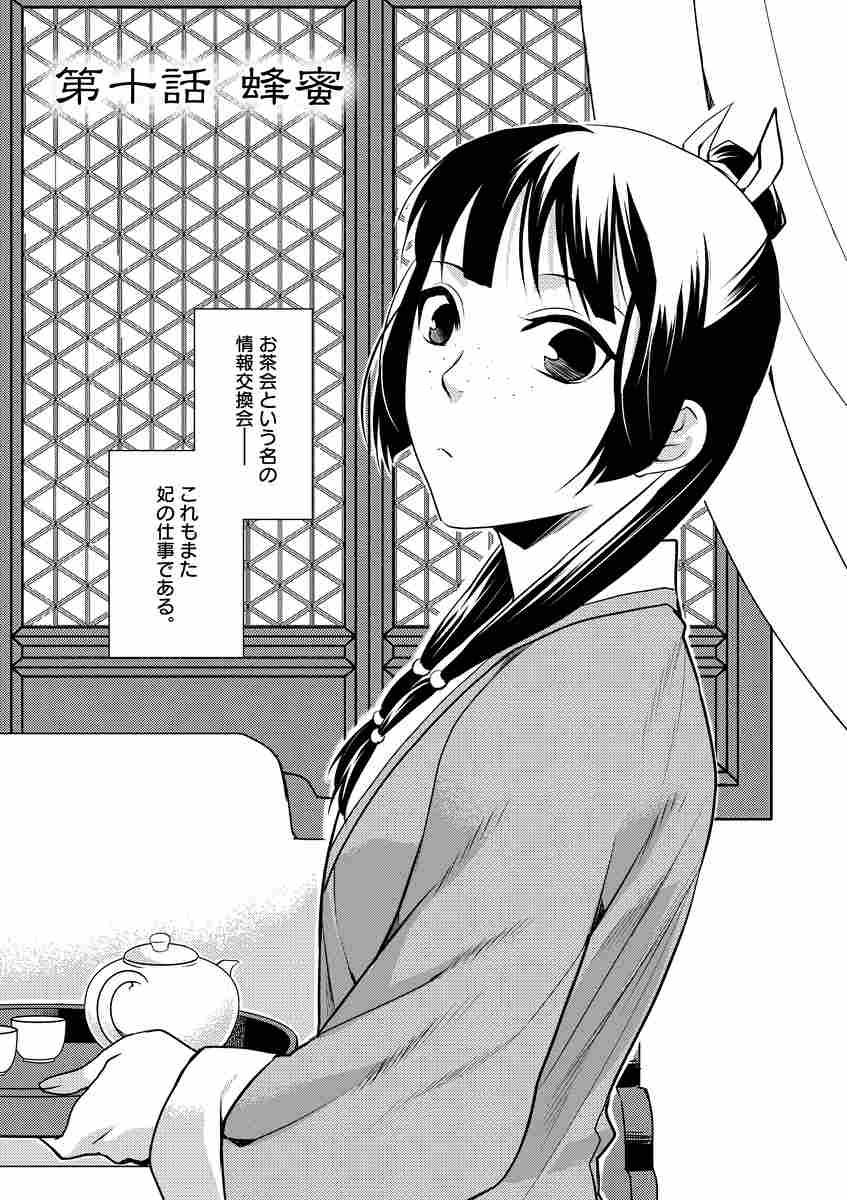 後宮の大イベント「園遊会」の最中、上級妃の一人・里樹妃の膳に毒が盛られるという大事件が発生する。自分が犯人だとの遺書を残して下女が自殺するが、不審に思った壬氏と猫猫は調査を進め…?