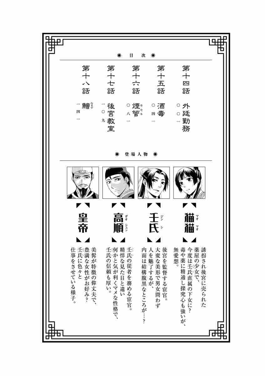 原作2巻に突入! 新しい妃も登場!! 壬氏(ジンシ)付きの下女として、再び宮中に戻った薬屋の少女・猫猫(マオマオ)。ところが高官の急死、謎のボヤ騒ぎ、原因不明の食中毒と、次々に事件が発生! その上、妃教育の講師役に任命されるなど、猫猫の日常は休む間もなくて――?