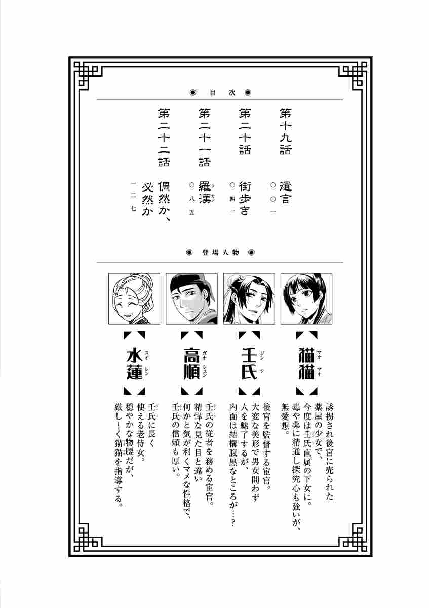小さな事件が重なり一つの大きな絵を描く! 美形宦官・壬氏(ジンシ)のおつきの侍女として宮中へ戻ることになった、毒好き少女・猫猫(マオマオ)。後宮にいた頃と変わらず、彼女の元には少し不思議な事件の話題がひっきりなしにやってくる。新たな事件は皇帝御用達の彫金細工師の御家騒動──亡き職人が息子達に残した遺言の謎に猫猫が挑む! そして曰くありげな、くせ者の武官・羅漢(ラカン)も現れて…!?