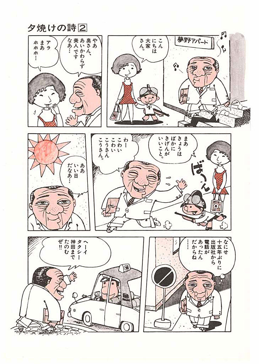 昭和30年代の世界に現代の心のふるさとを追う、珠玉のメルヘン。 ▼第1話/夢野平四郎の青春▼第2話/レモンティーの見た夢▼第3話/狂った映像▼第4話/斬り込み▼第5話/最後の休暇▼第6話/妖剣▼第7話/夕日のフライングマン▼第8話/狐塚▼第9話/鬼女の影法師▼第10話/異聞不知火小僧▼第11話/真夜中のミシン ●あらすじ/夢野平四郎は人気マンガ家。とはいってもそれは昔の話で、現在はアパートの経営者として悠悠自適の毎日である。だが、初老となった今も、マンガへの意欲は決して失ってはいない。そんな彼の元に、ある出版社から単行本発行の依頼がある。喜びいさんで新作の原稿を持っていった夢野だが、それは昔のヒット作の復刻版の発行依頼だった。その晩、複雑な思いで酒を飲む彼の前に、学生時代の親友が現れた…(第1話)。▼フルーツパーラーのボーイ・広平の趣味は、スポーツカーと輸入雑貨。とはいっても今の彼に出来る事といえば、車雑誌の切り抜きを寮の壁に貼って眺め、デパートの家具売場をひやかす事ぐらい。いつかは同僚のウエイトレス・ユキをスポーツカーに乗せ、彼女と幸せなマイホームを築くこと…それが広平の夢だった。だが、ある日彼はユキがエリートの若者と結婚してしまった事を知る…(第2話) ●本巻の特徴/現在のタッチとは少々異なる、劇画風の絵柄で描かれているのが第1~第6話。ストーリーも”せつない”話が多く、作者の意外な作風が見られる。