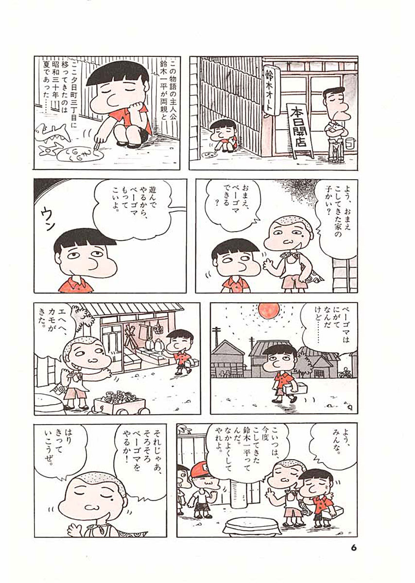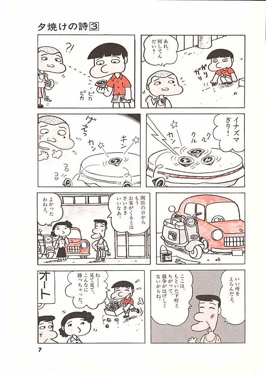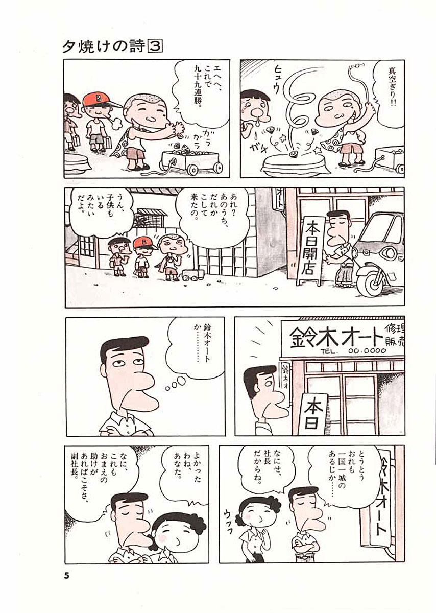 昭和30年代の世界に現代の心のふるさとを追う、珠玉のメルヘン。 ▼第1話/ベーゴマ仮面▼第2話/テレビ騒動記▼第3話/おばあちゃんの自転車▼第4話/サンマの味▼第5話/三丁目のナガシマさん▼第6話/結婚記念日▼第7話/師走の客▼第8話/除夜の鐘▼第9話/ミッちゃんと凧▼第10話/縁側の人▼第11話/雪の日の出来事▼第12話/干いも兄ちゃん▼第13話/ミッちゃんの初恋▼第14話/おじいさんの旗▼第15話/桜の木の下で▼第16話/変わり玉のひみつ▼第17話/五月の花嫁▼第18話/店主セミナー▼第19話/スカスカ人生▼第20話/六さんの休日▼第21話/学期末▼第22話/祭りばやし▼第23話/幻燈▼第24話/上野発23時20分▼第25話/山男の詩▼第26話/台風の夜▼第27話/父さんのチンチン電車▼第28話/三丁目のドラネコ ●登場人物/鈴木則文(鈴木オートの社長。働き者で子供には少々甘い)、鈴木トモエ(優しくてしっかり者のお母さん。時に怒ると恐い)、鈴木一平(鈴木オートの一人息子。ワンパクだが、気は優しい) ●あらすじ/時は昭和30年代の夏。ここは路地で子供たちがベーゴマの腕を競っているようなどこにでもある町、夕日町三丁目。そんな町に鈴木さん一家が引っ越してきた。お父さんは社長。だけど、苦労の末にお店を開いた、立派な一国一城の主だ。一方、息子の一平は近所のガキ大将に早速ベーゴマの挑戦を受ける。ベーゴマは苦手な一平だったが…(第1話)。▼三丁目の夕食時。山田さんの家には今日も近所の人たちが集まってきた。実は、ここは近所で唯一、テレビがある家なのだ。今日は大人気のプロレス中継の日。力道山の空手チョップに沸き上がる子供たちの歓声の中、山田さんも自慢げにビールを飲んでいる。だがこの頃のテレビといえば電波中断や故障が日常茶飯事で…(第2話)。 ●本巻の特徴/本シリーズの主役ともいえる”鈴木オート一家”がはじめて登場。この巻より、昭和30年代を舞台とした、現在の「三丁目の夕日」の世界を確立した