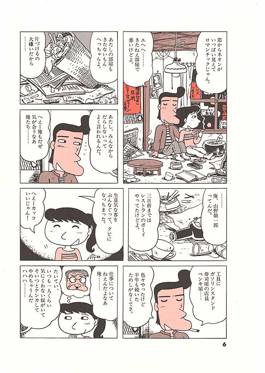 昭和30年代の世界に現代の心のふるさとを追う、珠玉のメルヘン。 ▼第1話/さよならジェームスディーン▼第2話/正月八景▼第3話/喫茶店スワン▼第4話/フランケン先生▼第5話/別れ道▼第6話/夜明けのランナー▼第7話/キンタロウ文庫▼第8話/イナズマ五段▼第9話/五月の風▼第10話/マネービル▼第11話/日真田氏飛び出す▼第12話/星はなんでも知っている▼第13話/招かれざる客▼第14話/出席シマス ●登場人物/鈴木則文(鈴木オートの社長。働き者で子供には少々甘い)、鈴木トモエ(優しくてしっかり者のお母さん。時に怒ると恐い)、鈴木一平(鈴木オートの一人息子。ワンパクだが、気は優しい) ●あらすじ/単調な毎日に不満を感じている女子事務員の広美は、ゴーゴー喫茶で不良がかった若者・敬一郎と知り合う。堪え性がなく、職を転々とっする敬一郎は「太く短く生きる」が身上。妙に意気投合した二人はやがて同棲を始める。給料が入れば毎晩二人で遊びまわり、金が無くなるとパンの耳をかじる。そんな自堕落な生活も、二人にとっては楽しい日々だったが…(第1話)。▼門前の日の丸や松かざり。ヤッコ凧を揚げる子供たち。三丁目にも新年がやってきた。いつもは男まさりなミッちゃんも、今日は着物姿であすまし。鈴木オートでは一平が獅子舞にかじられて大慌て。だが、年賀状が一枚も来ない駄菓子屋の茶川さんは、ちょっと寂しいお正月…三丁目の元旦の風景をスケッチした心温まる小編(第2話)。 ●その他のDATA/昭和30年代風物誌~貸本屋(第7話)