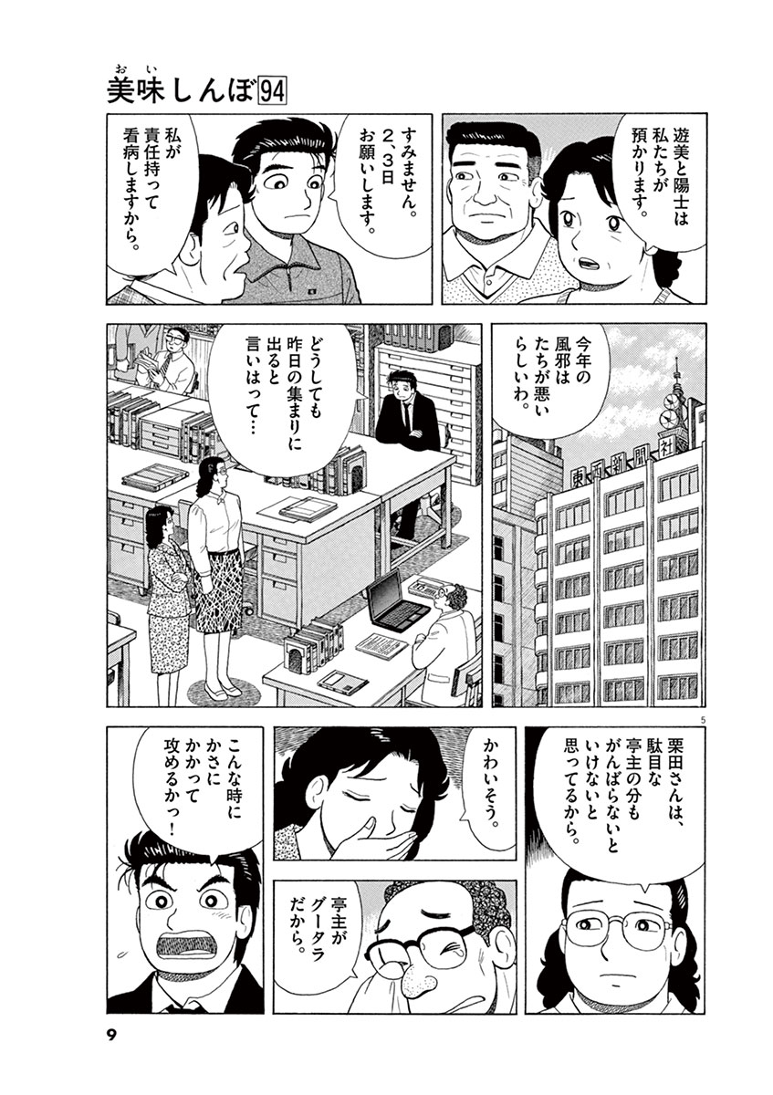 ▼第1話/いやしのカニ料理(前・後編)▼第2話/医食同源対決!!(1~4)▼第3話/温かいスープ▼第4話/降り積もる鍋▼第5話/牛肉の危機、再び!(前・後編)●主な登場人物/山岡士郎(東西新聞社文化部記者。膨大な食の知識を持つ「究極のメニュー」担当。ゆう子と結婚し、双子の父に)、山岡ゆう子(旧姓・栗田。東西新聞社文化部記者。夫の士郎とともに「究極のメニュー」を担当)、海原雄山(超高級料亭「美食倶楽部」を主催する希代の美食家。自分に反抗し家を出た実の息子・士郎を勘当、「至高のメニュー」で対決する)●あらすじ/究極vs至高の対決テーマを決める会議中、ゆう子が倒れてしまった。風邪をこじらせた彼女はなかなか食事がとれず、体調の回復も思わしくない。話を伝え聞いた雄山が、飛沢に「魯山人風 カニの薄葛仕立て」のレシピを授け、ゆう子の回復に一役買ったため、士郎は対決再開を前に、雄山から一本取られた形に…(第1話)。●本巻の特徴/士郎とゆう子が設定した「医食同源、人の身にも心にも力を与える食べ物」をテーマに、究極vs至高の対決が再開された。しかも、士郎は今回の対決を皮切りに「究極のメニュー」が完成への段階に進むと宣言。並々ならぬ決意で臨んだ対決の行方は…? 表題作「医食同源対決!!」他、全5話を収録。●その他の登場人物/大原大蔵(東西新聞社主)、小泉鏡一(東西新聞社取締役編集局長。プライドが高く、自説を曲げない頑固者)、谷村秀夫(東西新聞社編集局次長兼文化部長。温厚な性格で常に冷静。部下からの人望が厚い)、富井富雄(東西新聞社文化部副部長)、飛沢周一(東西新聞社文化部記者)、難波(東西新聞社政治部記者。ゆう子の先輩で料理研究家の紺野と恋仲に)