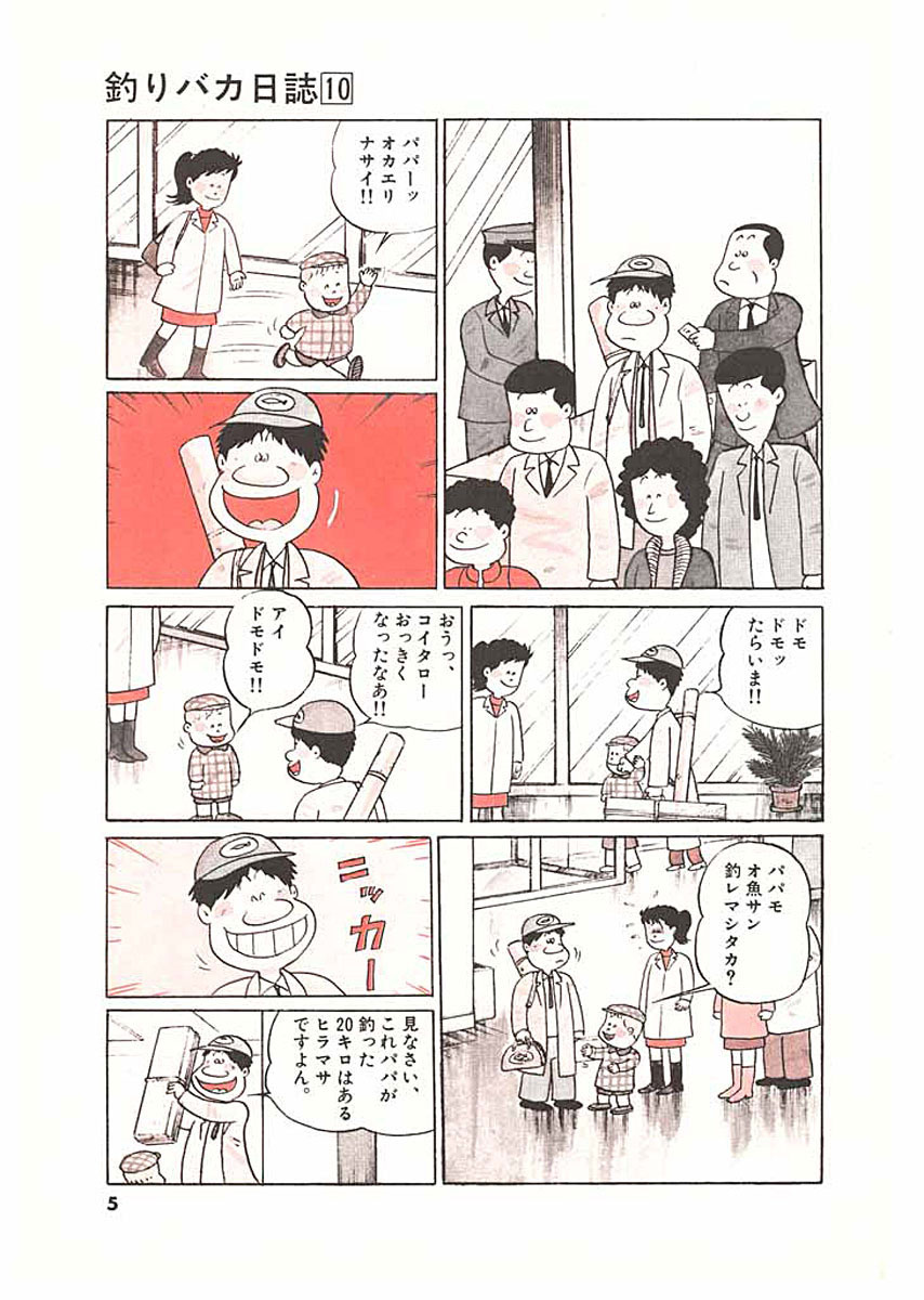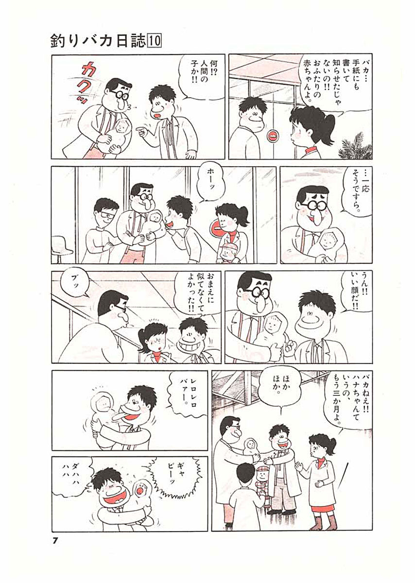 ご存じ“釣りバカ”ハマちゃんとスーさんが繰り広げる珍騒動!! ▼第1話/ドモドモ課長!!でカムバック▼第2話/10年目の同期会▼第3話/噂のシーズン▼第4話/多胡氏のあとがま▼第5話/新入社員の教育係!?▼第6話/五月晴れと五月病▼第7話/何を官費のムダ遣い!!▼第8話/流れる雲のように▼第9話/拝復 優介様▼第10話/番外編・竜馬が釣る ●登場人物/浜崎伝助(釣りバカで万年ヒラのペケ社員)、鈴木一之助(鈴木建設社長)、佐々木和男(鈴木建設営業三課課長)、浜崎みち子(伝助には過ぎた明るく賢い奥さん)、浜崎鯉太郎(伝助とみち子の可愛いひとり息子) ●あらすじ/単身赴任先の四国から再び本社に呼び戻された伝助。ある日、伝助が幹事を務める同期会が開かれた。この同期は優秀な人材が集まっているとの定評があり、皆すでにそれなりの役職に付いている。いまだにヒラなのは伝助だけなんであるが、そこは伝助、全然へっちゃら……というかナーンにも気にしていないのだった(第2話)。 ●本巻の特徴/春は入学、入社のシーズン。この第10巻では営業三課にも宗君という新入社員が登場。この宗君はまじめを絵に描いたような人物で、しかも東大出身という秀才なのだが、彼の教育係をかって出たのがなんと万年ヒラのペケ社員、伝助だった……(第5話)。 ●その他の登場キャラクター/次期社長と目される鈴木社長の甥・多胡(第1、2、4話)、多胡の奥さん・中村礼子(第1話)、伝助と同期の社員・牧田(第2、4話)、東大卒で営業三課の新人・宗優介(第4~9話) ●その他のデータ/タナゴ釣り(第4話)、スズキ釣り(第4、5話)、▼裏表紙の伝助釣り講座~スズキ