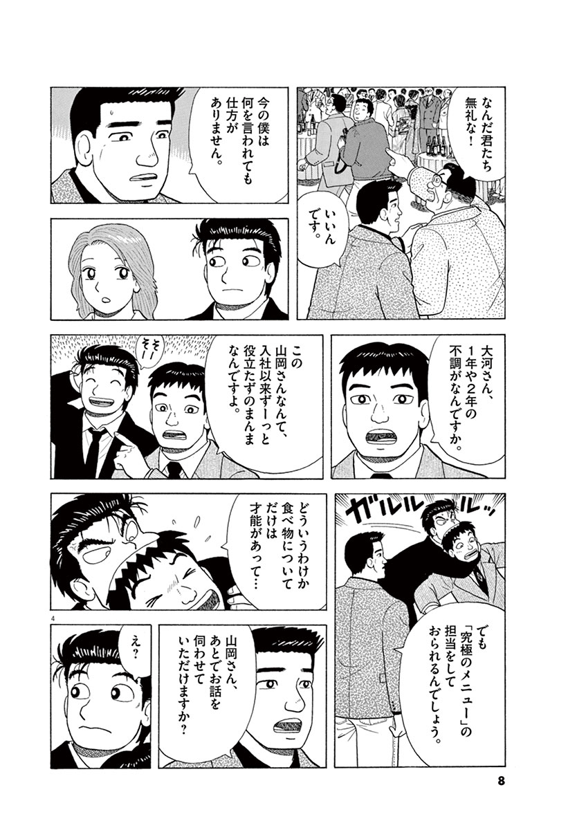 ●主な登場人物/山岡士郎(東西新聞社文化部記者。膨大な食の知識を持つ「究極のメニュー」担当。ゆう子と結婚し、双子の父に)、山岡ゆう子(旧姓・栗田。東西新聞社文化部記者。士郎とともに「究極のメニュー」を担当)、飛沢周一(東西新聞社文化部記者。取材を通して雄山に心酔し、弟子のような存在に。「究極のメニュー」の次期担当候補でもある)